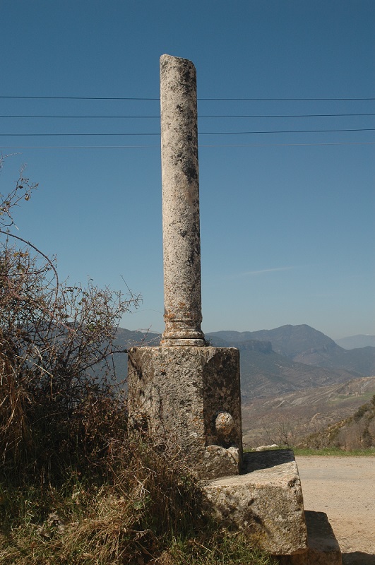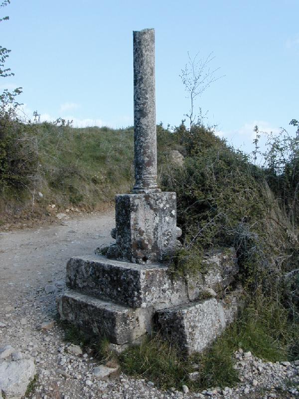 Apoya sobre alto basamento de sección octogonal con cuatro relieves de medias esferas distribuidos de forma alterna en sus caras. Bajo este se disponen dos bloques monolíticos de forma escalonada.