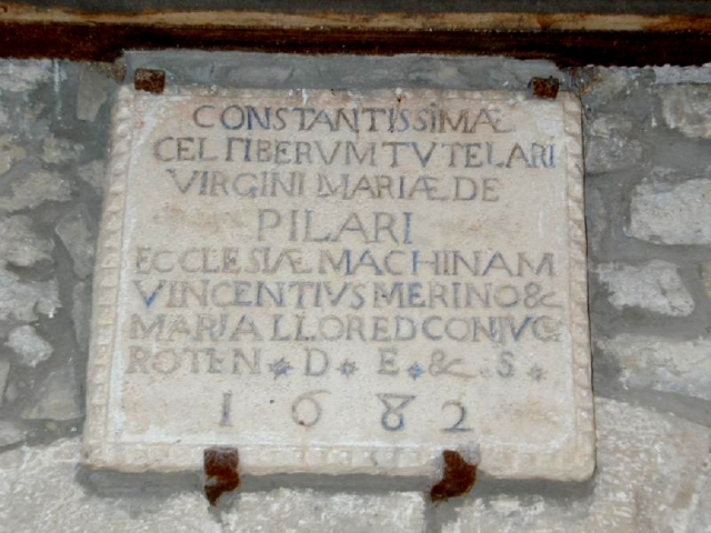 Construida en aparejo de mampostería cubre con tejado a dos aguas de losa. La puerta, dovelada en piezas anchas y de radio mediano, está flanqueada por dos ventanitas de dintel, jambas y antepecho de piedra, cada elemento en una pieza, decoradas con bisel en la arista. Sobre la puerta, placa de piedra con siguiente leyenda: "CONSTANTISSIMA // CEL RIBERUM TUTELARI // VIRGINI MARIÆ DE // PILARI // ECCLESIÆ MACHINAM // VICENTIUS MERINO & MARÍA LOLRED CONIUG // ROTEN D E & S // 1682.