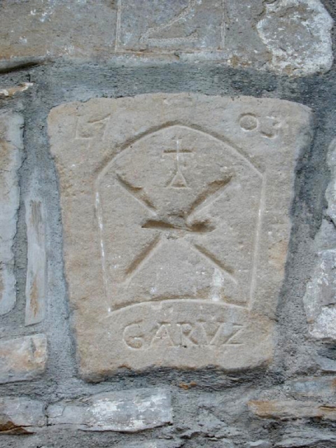 Casa que con la vivienda y las construcciones auxiliares forma un recinto semicerrado en torno a un espacio central que tuvo las funciones de corral y era. Al N y E está cerrado por el espacio de vivienda que en la planta baja del lado N abre a la era con dos arcos; al S por dos pajares cerrados y al O por torre precedida por edificio de dos pisos con arcada de tres vanos, ahora cegados, en la planta baja. El acceso desde el exterior se realiza desde el ángulo SE. Desde la calle ofrece una fachada muy reducida que se limita a un cuerpo de dos plantas que articula la unión entre las alas de vivienda (N y E). En la planta baja se instala la puerta en arco de medio punto precedida por porche cubierto con tramo de bóveda de cañón. En la rehabilitación que están llevando a cabo los propietarios, que por el momento sólo afecta al espacio de vivienda, se colocaron en esta fachada dos escudos procedentes de otras partes de la casa. Uno de ellos estaba colocado sobre la puerta de una capilla, ahora inexistente, ubicada delante de la casa, cerrando la calle por el lado E. Está realizado en un bloque de caliza del que se ha fragmentado un lateral. Se trata de un escudo con un solo campo acabado en punta en cuyo interior se han tallado tres filetes horizontales; al exterior, por incisión, se decora con líneas que se enroscan en roleos. El segundo, colocado sobre el porche, procede de la clave de una puerta. El trabajo se ha realizado por incisión, siendo el motivo principal una cruz en aspa con un travesaño horizontal corto; encima, cuz latina que arranca de un pequeño calvario. Se delimita por forma en escudo invertida. En la parte superior de la dovela, la fecha 1703 y, en la inferior, "GARUZ". De la puerta se pasa al porche abierto hacia la era y orientado al sol de mediodía; enfrente de la puerta arrancan las escaleras de acceso a la planta superior. El elemento más destacado del conjunto es la torre O. Construida en mampostería, trabada con bastante mortero a partir del segundo piso, en el que la superficie llega a revocarse. Cubre con tejado de losas a dos vertientes. Tiene cuatro plantas, estando la última separada por una moldura recta. Al O abren tres ventanas con perfiles cuadrados delimitados por cuatro piezas de piedra para dintel, jambas y antepecho. Los lados E y S están modificados, porque la torre, que en principio estaría habitada, amplió sus estancias con construcciones adosadas a estos frentes. Se levantó un edificio de dos plantas en mampostería, cubierto a dos vertientes con tejado de losa, que en la planta baja abre con tres arcos hacia el E. Este sería el espacio destinado a las cuadras. En la segunda planta, también orientada hacia el sol de la mañana, se instaló una solana con acceso en puerta adintelada desde la torre. De este lado sobresalen los dos últimos pisos de la torre con la presencia e un palomar que, posiblemente, obligara a hacer una entreplanta interior para acceder a él. La ampliación continuó con las bordas adosadas del lado S. Debieron tener un alero en saledizo que en el ángulo de unión con la casa se convirtió en cubierto Sería en el siglo XVIII cuando la torre y su ampliación resultan demasiado reducidos y se decide la construcción de la actual vivienda.