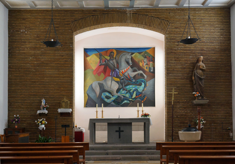 De la torre parten dos galerías sobre columnas de hormigón, dispuestas en ángulo recto, que conducen hacia las respectivas entradas de la iglesia, en el lado de la epístola (sur), y de la casa rectoral. Esta suerte de crujías unen a los integrantes del conjunto, a la vez que dejan un espacio cuadrado, semiienterior, a modo de claustro.