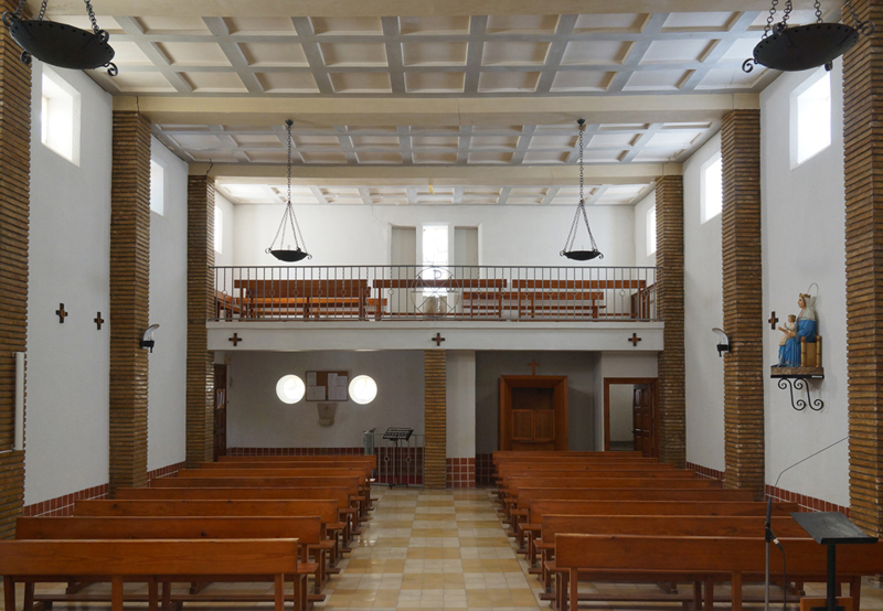El interior se visualiza como un espacio único, dividido en cinco tramos por las pilastras de ladrillo visto, mientras que el resto del paramento está revocado y enyesado. De ladrillo visto es también el frente en el que se encuentra abierto el altar en arco rebajado.
