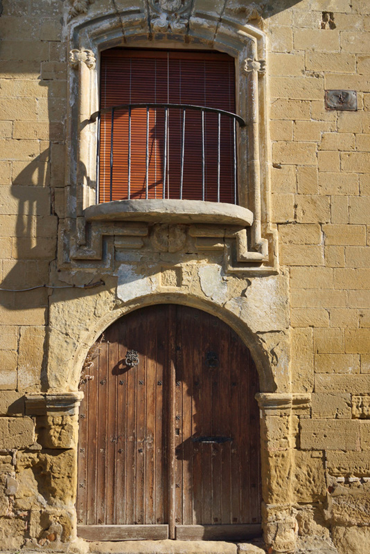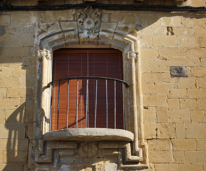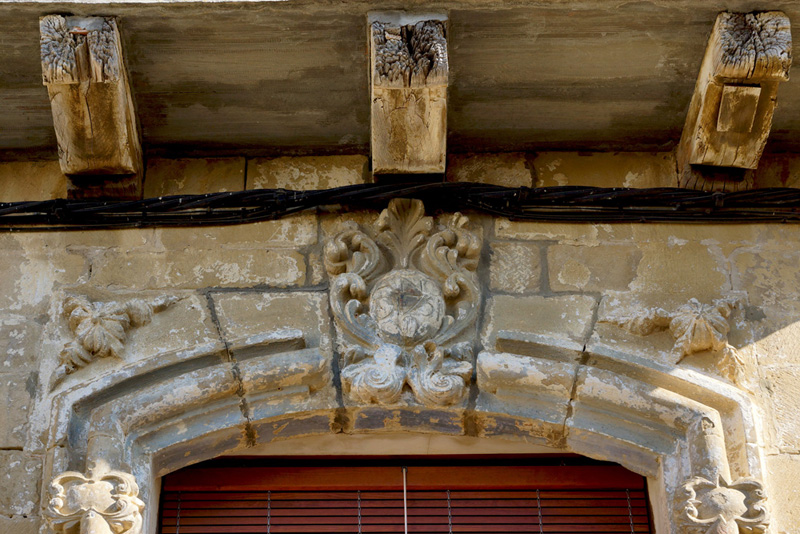 Inmediatamente sobre el arco de la puerta se sitúa el balcón, de solado semicircular y apertura en arco muy rebajado. Todo el hueco está enmarcado por dos gruesas molduras en bocel, que su parte inferior adoptan una forma escalonada para enmarcar y resaltar la portada situada debajo. En la clave hay un medallón convexo con la fecha de 1751 rodeado por relieves vegetales; asimismo, en las esquinas del marco moldurado hay otros florones tallados en relieve.