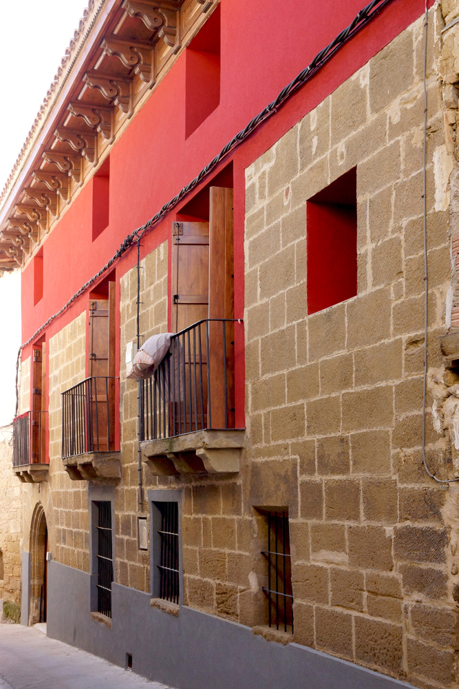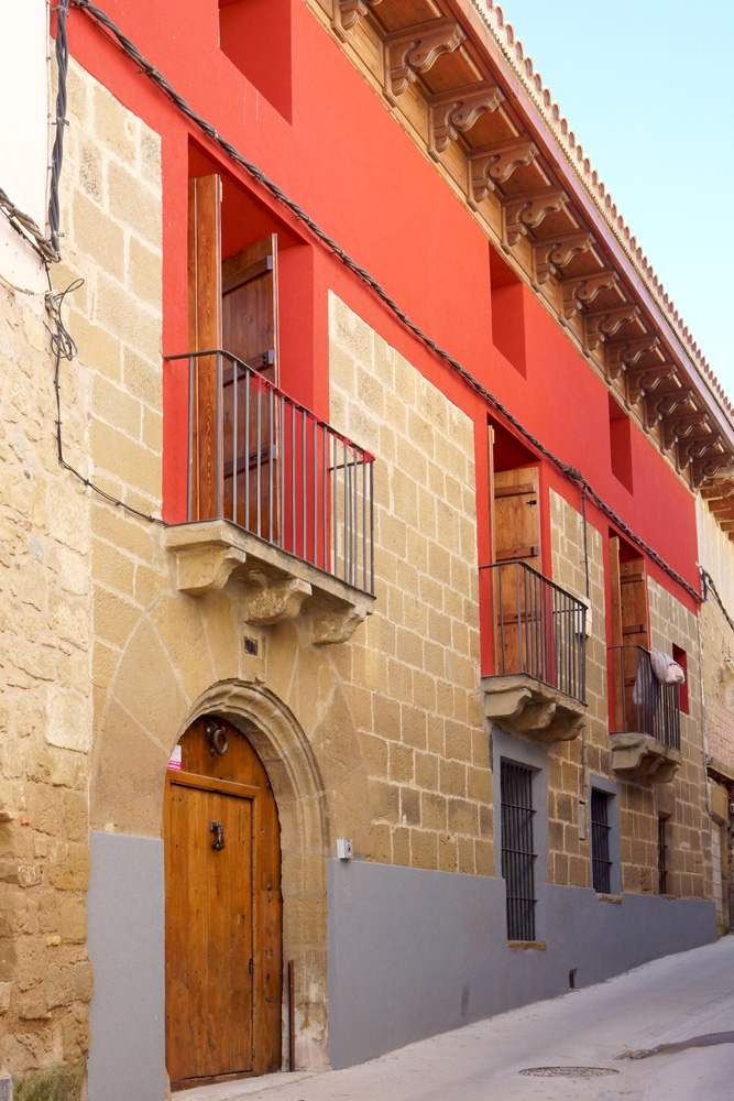 En la planta principal se abren también tres balcones realizados enteramente en arenisca. Están compuestos por una losa monolítica que descansa sobre tres grandes ménsulas de perfil convexo-cóncavo; en uno de los casos estas ménsulas están situadas sobre las dovelas de la portada, por lo que parecen de construcción posterior a esta. En uno de los extremos hay una pequeña adintelada que sí puede corresponder a la construcción original.