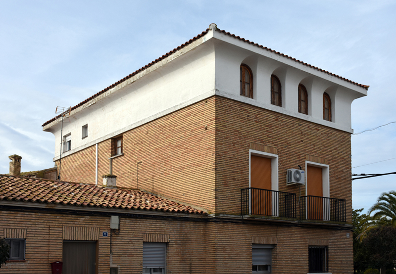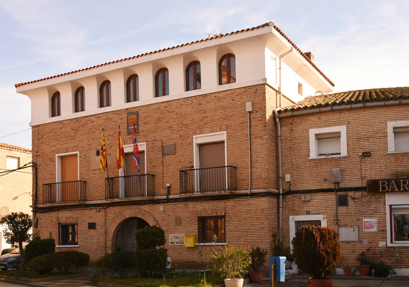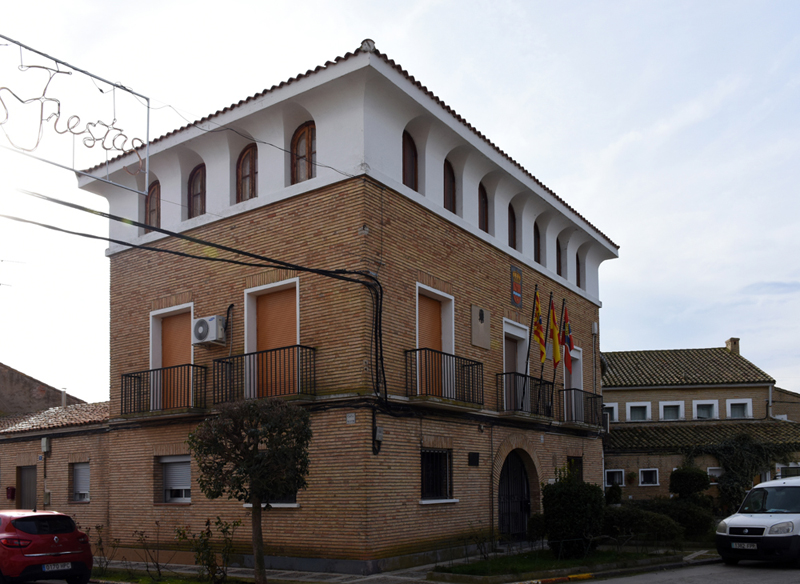 El edificio tiene tres pisos, elevados sobre planta rectangular, y consta de tres cuerpos. La planta baja carece, en este caso, del característico pórtico, pero cuenta con un gran vano en arco de medio punto, que da entrada a un pequeño porche. La planta noble está definida por los balcones, y en la última, bajo cubierta, abierta a la plaza y a la calle Mayor, se encuentra la característica galería de arquillos. Esta galería, inspirada en la arquitectura renancentista aragonesas, se convirtió en un elemento habitual del repertorio del Instituto de Colonización y de Regiones Devastadas, por responder a sus criterios historicistas y regionalistas. El alero es una moldura curva en la que se crean pequeños lunetos sobre la vertical de los vanos.