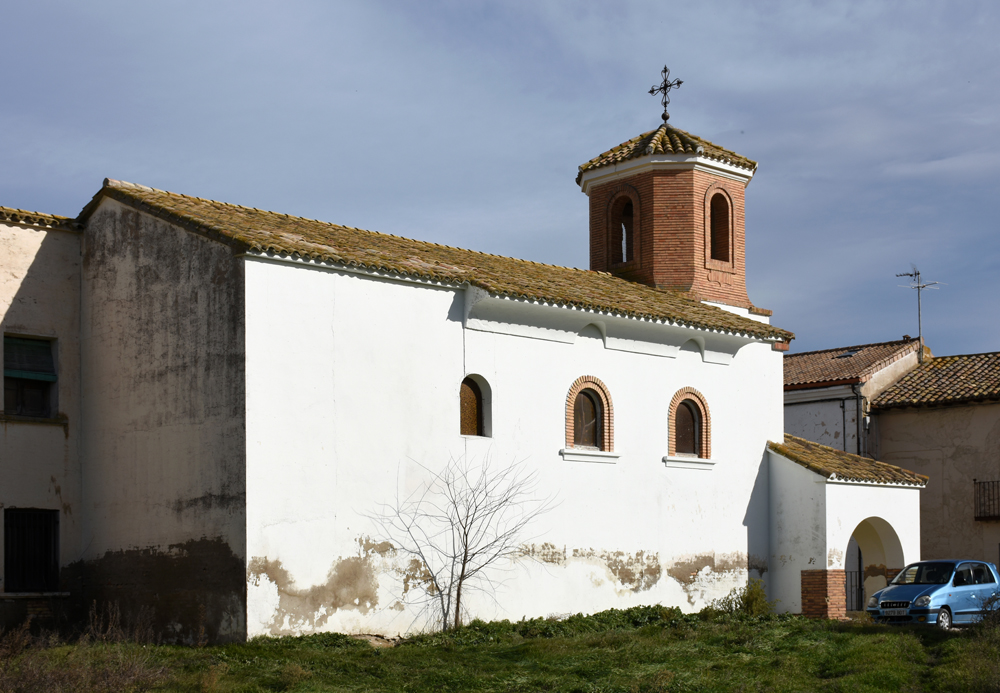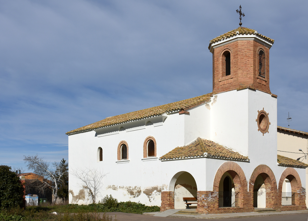 La entrada, en arco rebajado, se efectúa bajo el pórtico, abierto en el frente y en los extremos por arcos de medio punto con ladrillos a la vista en el despiece de las roscas, en el zócalo y en los pilares. Este juego decorativo con el ladrillo visto se realiza también en el resto de los vanos (ventanas de la nave, óculo de la torre) y en el segundo cuerpo de la torre.