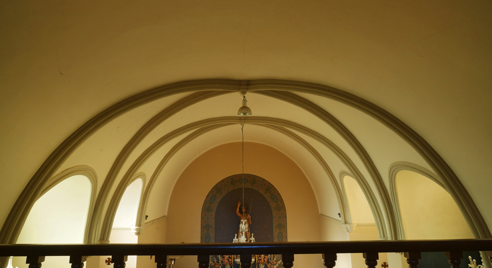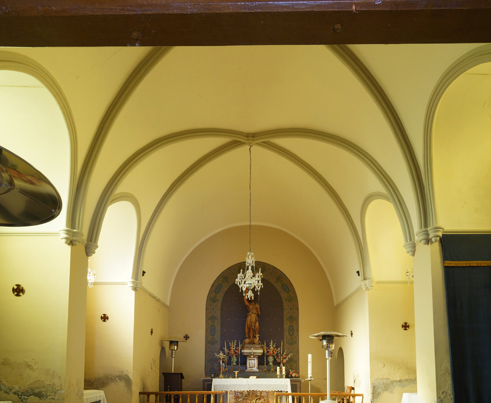 Está cubierta por teja árabe que en los laterales de la nave apoya sobre una moldura de yeso en cuarto de bocel con arquillos sobre la vertical de los vanos.