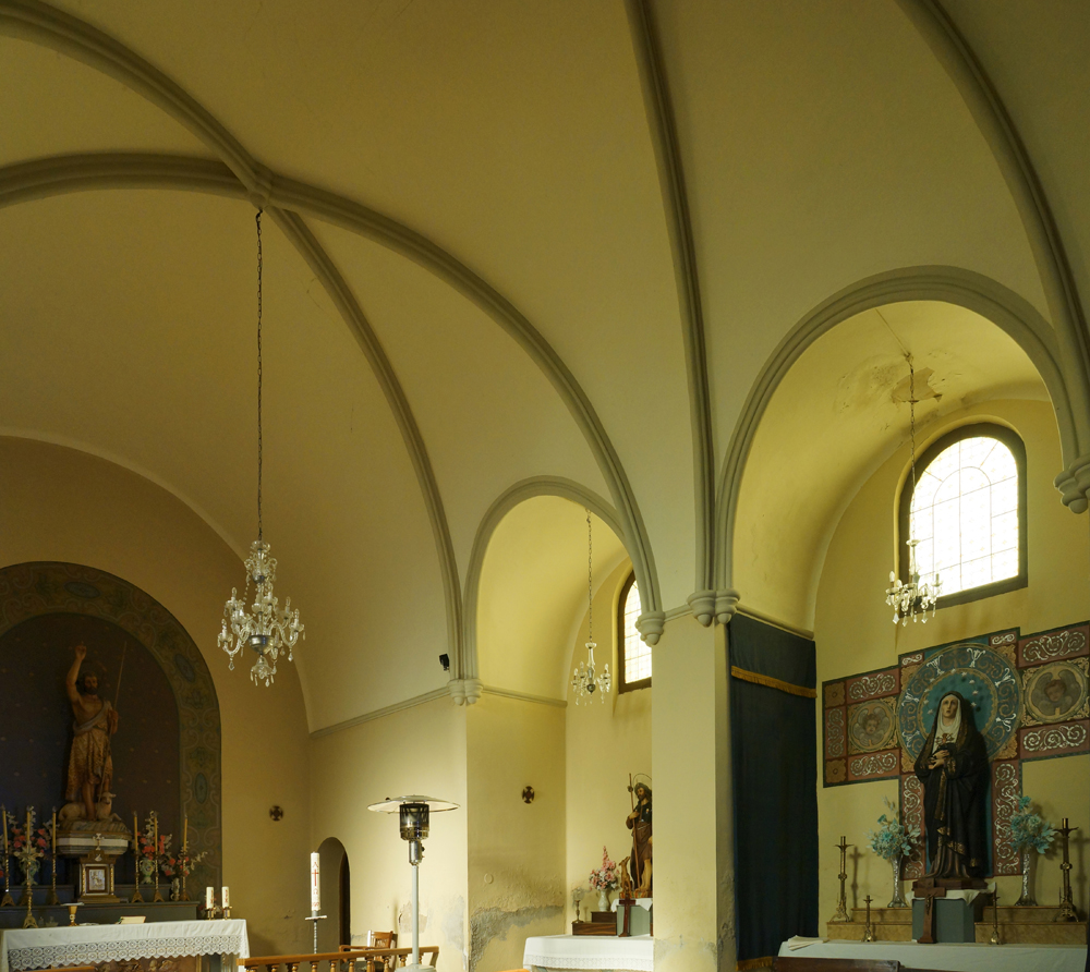 La cubrición se resuelve con bóvedas de crucería en los tramos centrales, y, con cañón, tanto en el resto de los tramos de la nave como en las capillas.