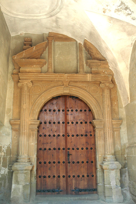 El acceso a la iglesia se realiza atravesando un pórtico, abierto en su frente con arco de medio punto, situado en el muro meridional. Este anexo del edificio alberga, además de la entrada, las dos capillas y la sacristía del lado de la Epístola. La portada tiene una composición clásica y consta de un primer cuerpo con arco de medio punto moldurado que apoya en imposta en resalte y con jambas de fuste cajeado. En las enjutas del arco se disponen motivos geométricos en relieve. El arco está flanqueado por dos columnas con fuste estriado, sobre alto pedestal, y capiteles jónicos, que sostienen un segundo cuerpo con frontón partido y hornacina en su interior.