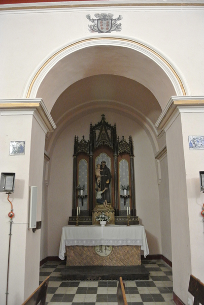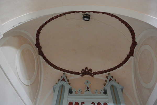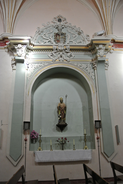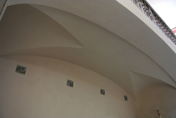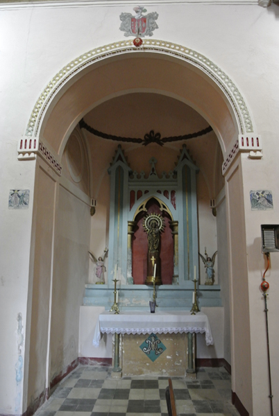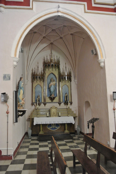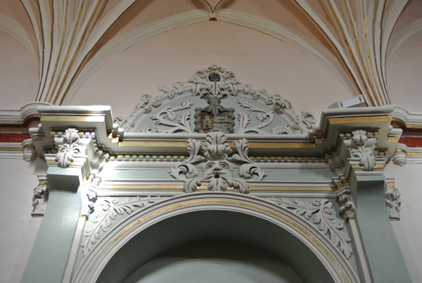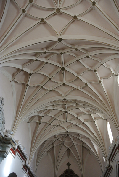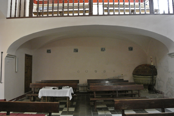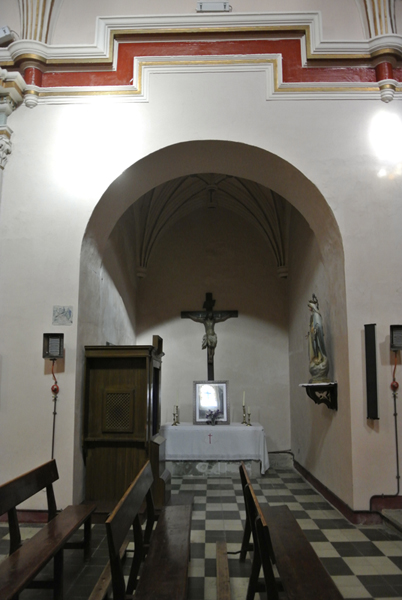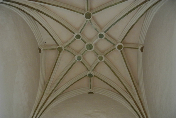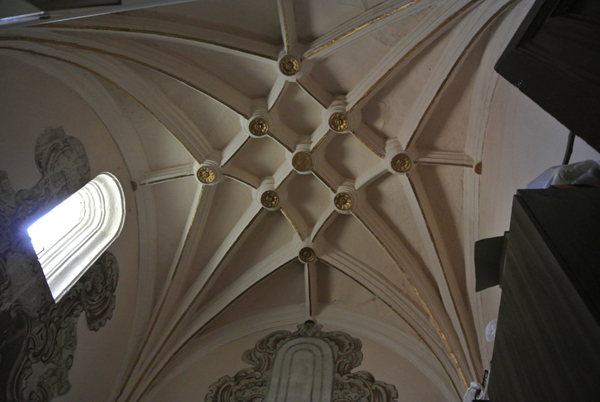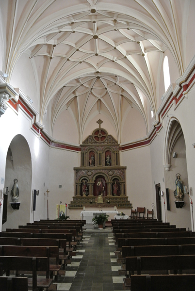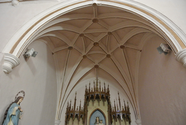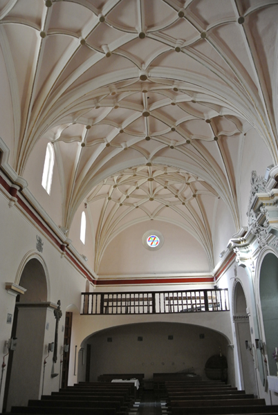 En el interior la nave está dividida en cuatro tramos cubiertos por bóvedas estrelladas que apoyan en una cornisa moldurada.