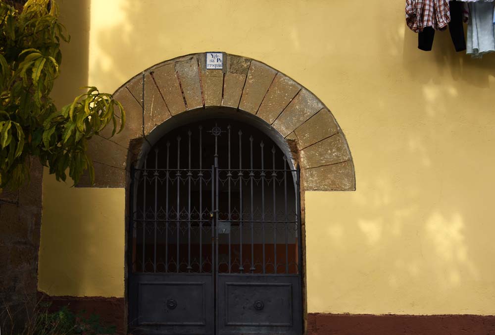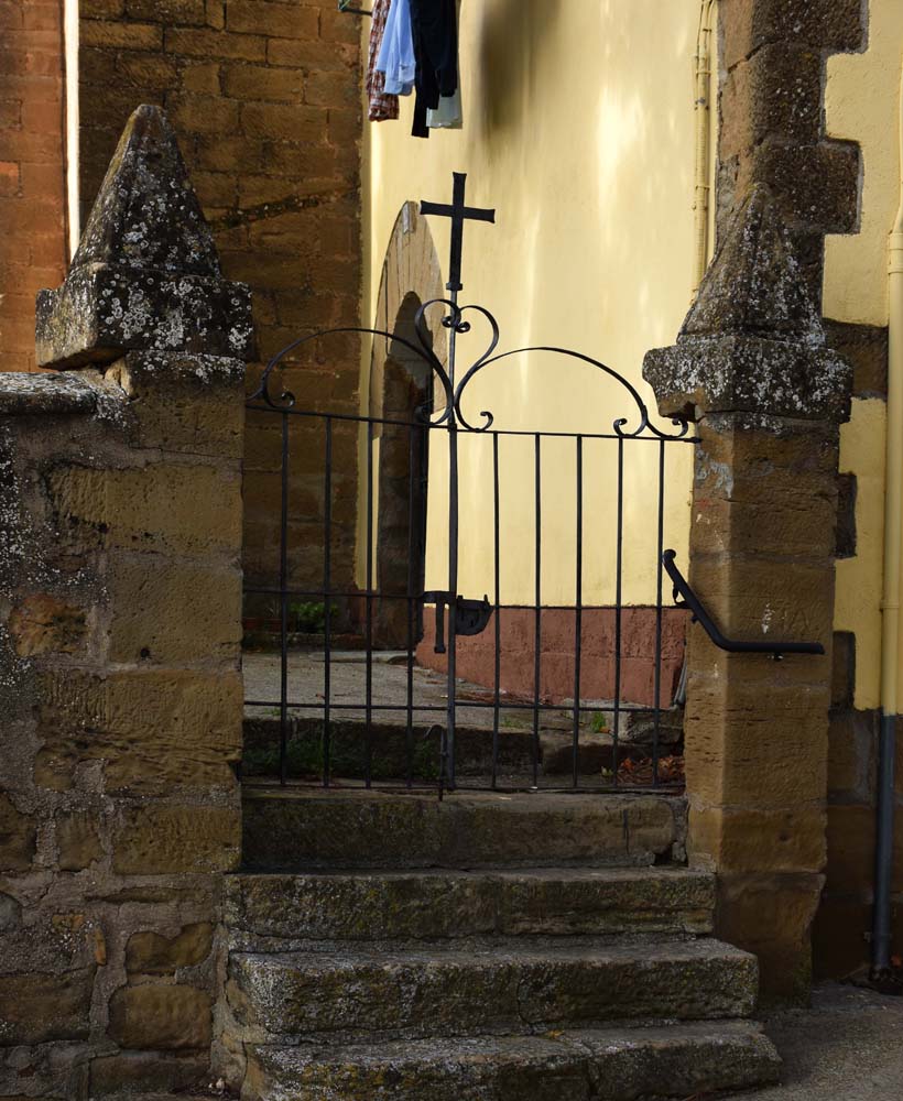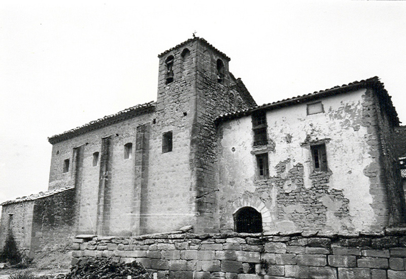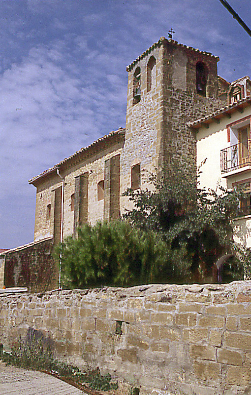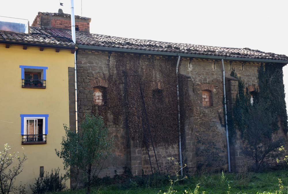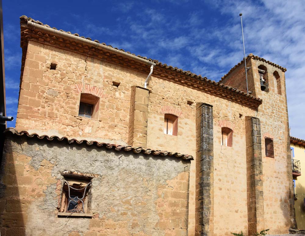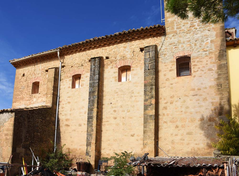 Forma conjunto con la antigua casa abadía, que se encuentra adosada a sus pies y en cuyo interior se integra el pórtico y la puerta de acceso al templo. La abadía es actualmente una vivienda particular y está restaurada. El conjunto está delimitado por el lado sur por un muro construido en su mayor parte mediante sillares de arenisca. El acceso al recinto se encuentra en el extremo que confronta con la casa abadía; es un simple hueco flanqueado por jambas de sillería coronadas por piramidones.