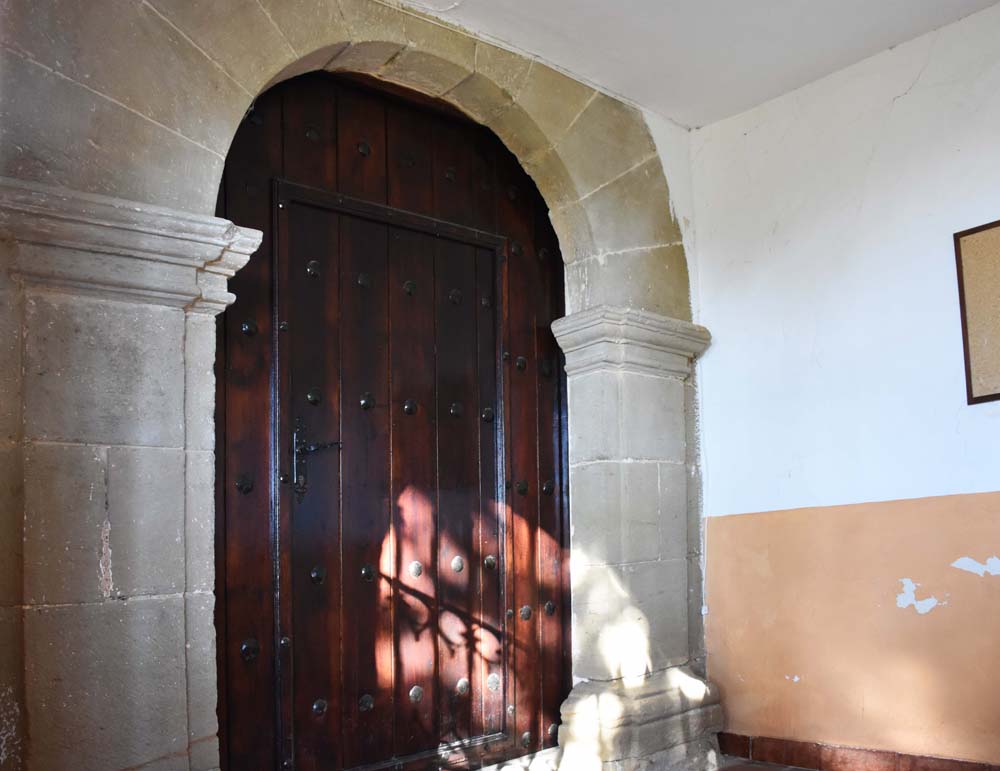 Ante la puerta hay un pórtico integrado en la parte baja de la casa abadía, que es de construcción posterior a la iglesia, cuya puerta originalmente quedaría abierta al aire libre. El atrio es un sencillo espacio cuadrangular, cubierto con cielorraso, al que se accede a través de una puerta en arco de medio punto de dovelas estrechas, que se van ensanchando ligeramente hacia la base.
