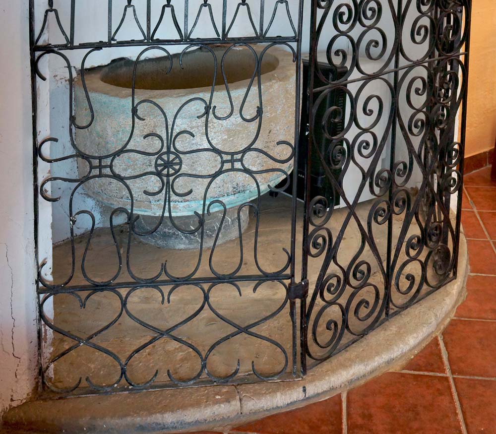 A los pies, bajo el coro, se abre un pequeño espacio protegido por reja de forja que alberga la pila bautismal, una sencilla pieza de sección circular dispuesta sobre un corto pie cilíndrico.