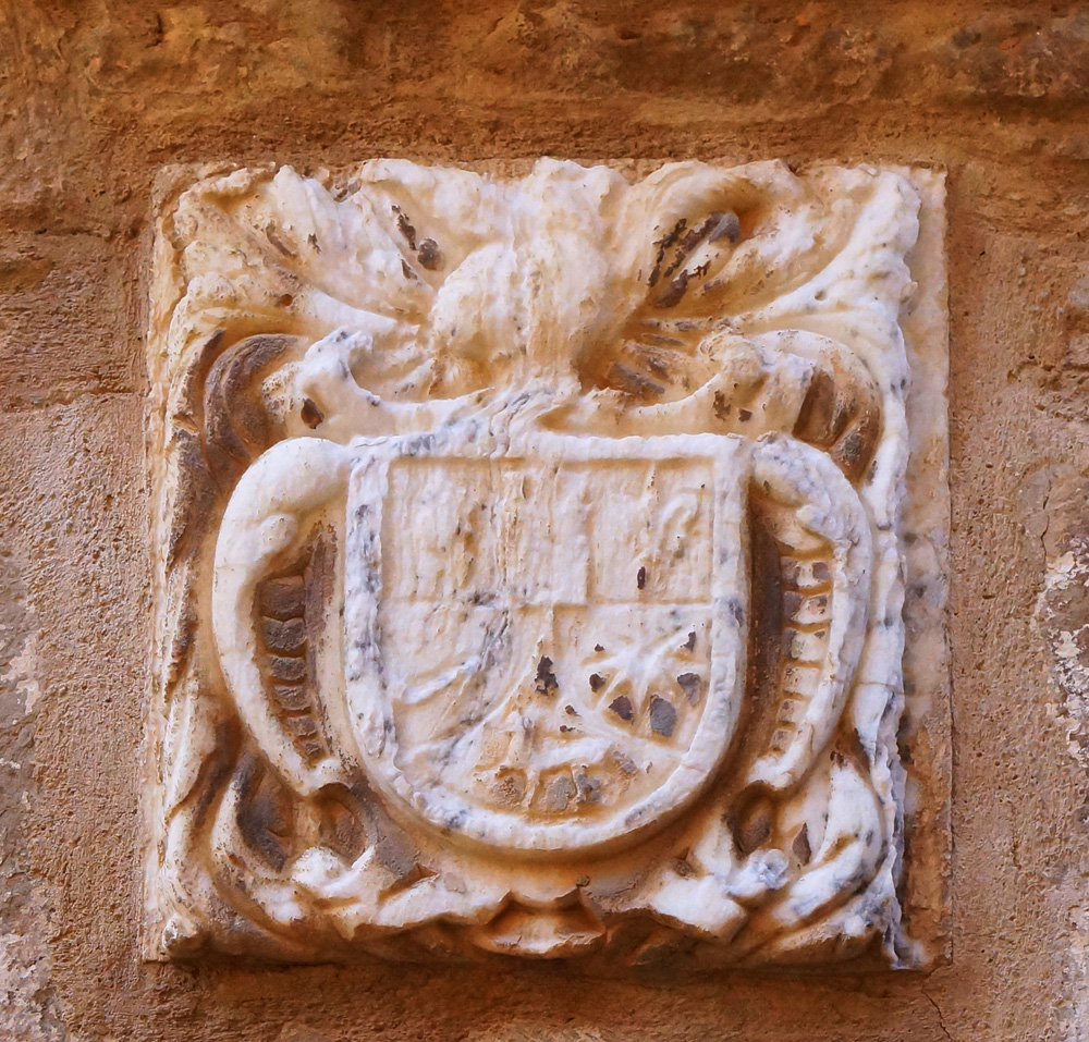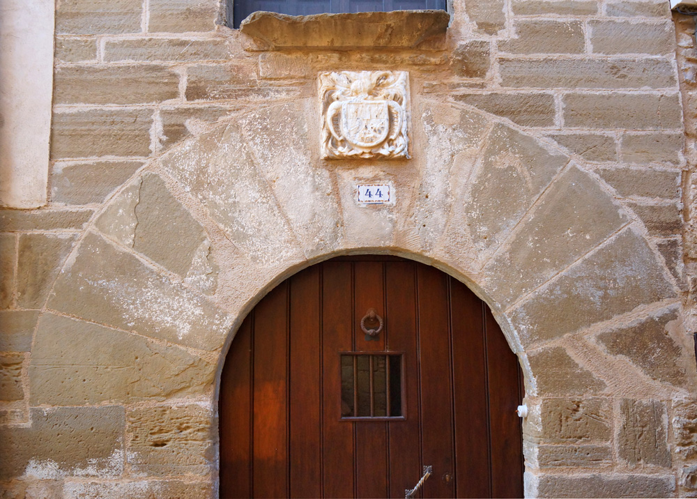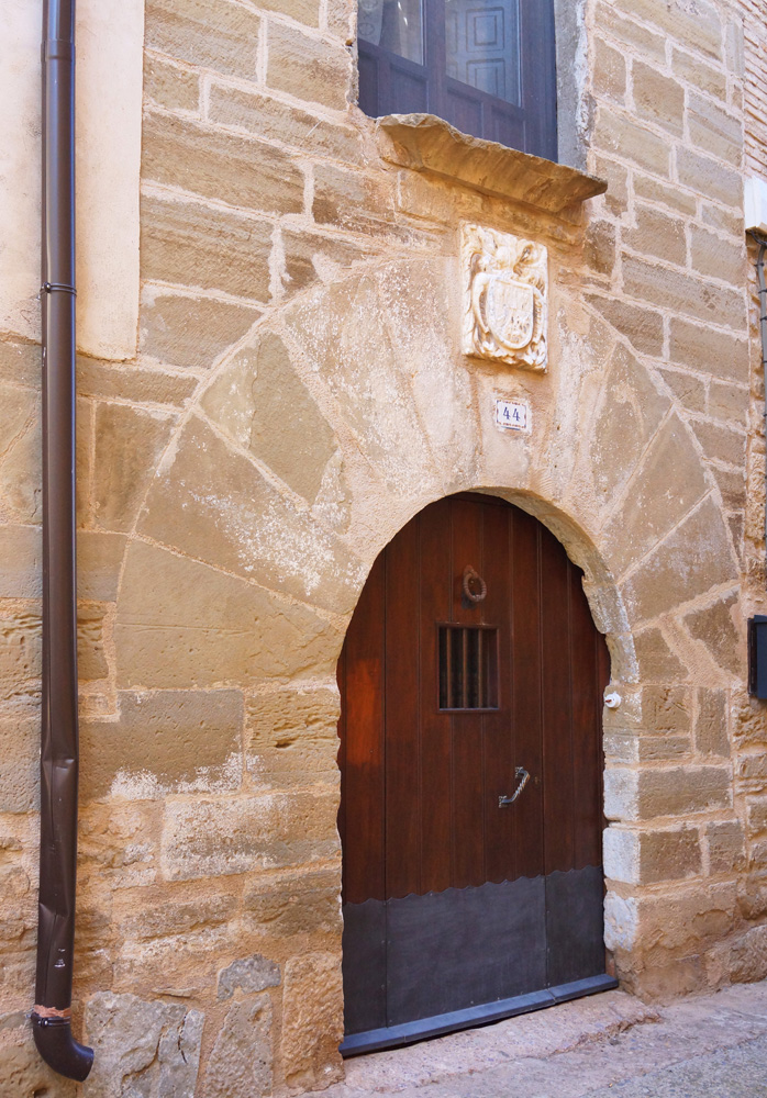 La puerta se encuentra descentrada hacia la parte izquierda de la fachada. Es un vano en arco de medio punto, con dovelas que van ensanchándose de forma simétrica a partir de una clave central más estrecha. Cubriendo parcialmente esta, se colocó con posterioridad un escudo de armas realizado en alabastro que pudo haber correspondido a alguna rama de la familia Lorés, si bien se encuentra demasiado desgastado para identificar todos sus motivos. Coronado por timbre de hidalguía y enmarcado por lambrequines vegetales, el cuerpo está cortado en dos bandas; en la superior podrían aparecer las armas de la familia, que eran una torre flanqueada por una cabeza masculina y una flor de lis (esta última puede distinguirse perfectamente); en la mitad inferior pueden distinguirse una mano con una varilla, una estrella y un cuadrúpedo.