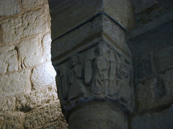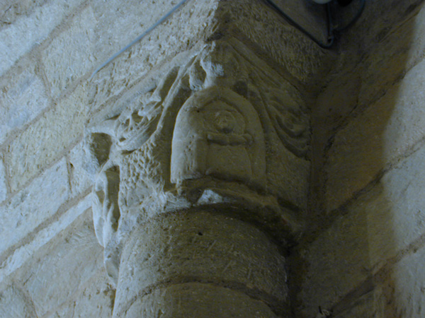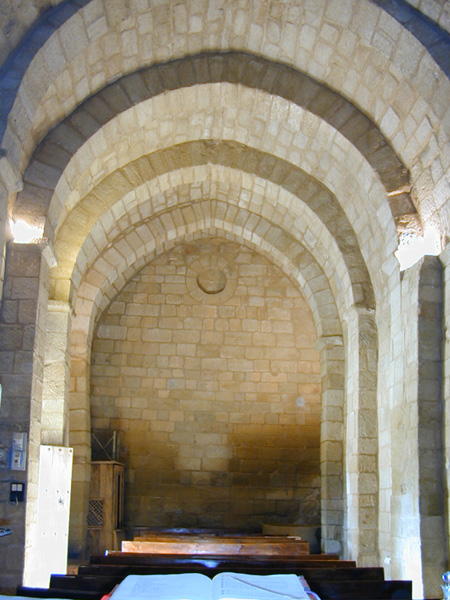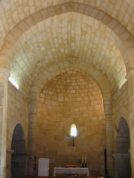 En el interior la nave central se cubre con bóveda de cañón apuntado y queda dividida en cuatro tramos mediante arcos fajones apuntados que apean en pilastras a través de imposta biselada. El templo cuenta con un amplio presbiterio con dos capillas laterales cubiertas por bóveda apuntada y un ábside cubierto con bóveda de cuarto de esfera. En la zona de la cabecera se conservan capiteles historiados en las columnas del presbiterio con escenas de adulterio o avaricia y del juicio de las almas. Toscamente labrados aparecen en uno dos demonios agarrando a un hombre y a una mujer que lleva un niño en su seno mientras otra mujer llora en el extremo. En el otro capitel unos ángeles pesan el alma de dos hombres, mientras un demonio tira de uno de los platos de la balanza.