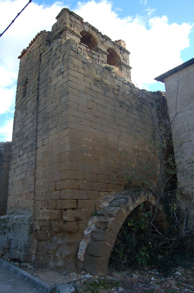 La torre se encuentra a los pies del templo. Está construida en sillería y recrecida posteriormente en mampostería en hiladas regulares en la parte superior. Es de un solo cuerpo y está rematada por una espadaña con doble ojo en arco de medio punto donde se sitúan las campanas. Adosado al lienzo occidental de la misma, queda el arranque de un arco apuntado, quizá parte de una bóveda de estructuras adyacentes ya desaparecidas.