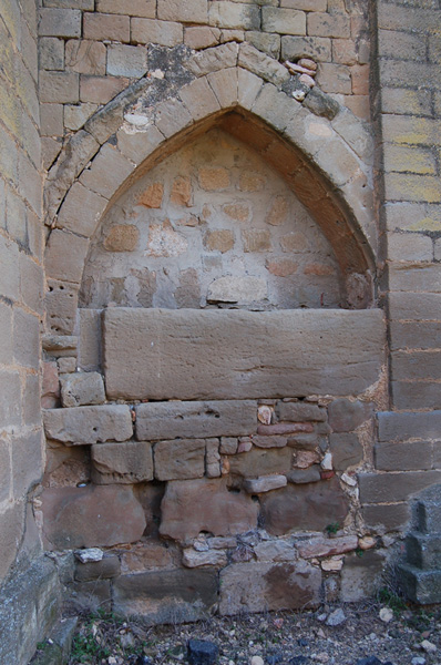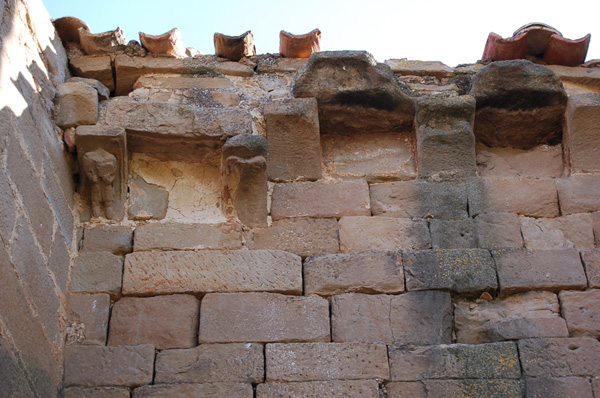 En el exterior del templo recios contrafuertes modernos contrarrestan la divergencia de los muros. Dos de los contrafuertes están situados en el muro sur y otros dos en el norte. En el lado norte queda un sepulcro bajo un arcosolio en arco apuntado y, sobre él, en la parte superior del muro un par de canecillos decorados. Hay dos canecillos historiados, muy deteriorados, en la zona de la cabecera.