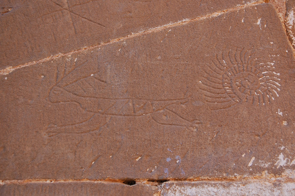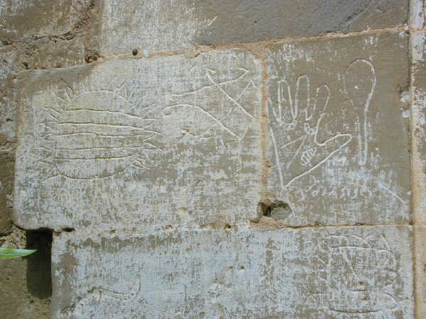 La entrada situada en el muro meridional fue rehecha posteriormente y sobre ella se coloca un óculo de iluminación. La portada es de arco de medio punto dovelada. Las dovelas y los sillares de las jambas tienen unos grabados incisos donde aparecen figuras de animales (ciempiés, escorpión, gusanos, aves, etc.) y otros símbolos de difícil interpretación. Hay un grabado que muestra una mano llagada con el detalle de las líneas de la palma y tres bubas o pupas junto a una cuchara que han sido interpretados con exvotos. En la ermita de Nuestra Señora de Bureta de Fañanás también hay grabadas manos y figuras de animales en las dovelas del arco de entrada.