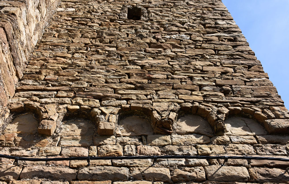 La torre construida con mampostería sobre el antiguo ábside tiene un único cuerpo en cuyo lado este se abren dos vanos en arco de medio punto para campanas. La puerta está en alto, con acceso mediante una escalera de mampostería adosada al muro norte del ábside.