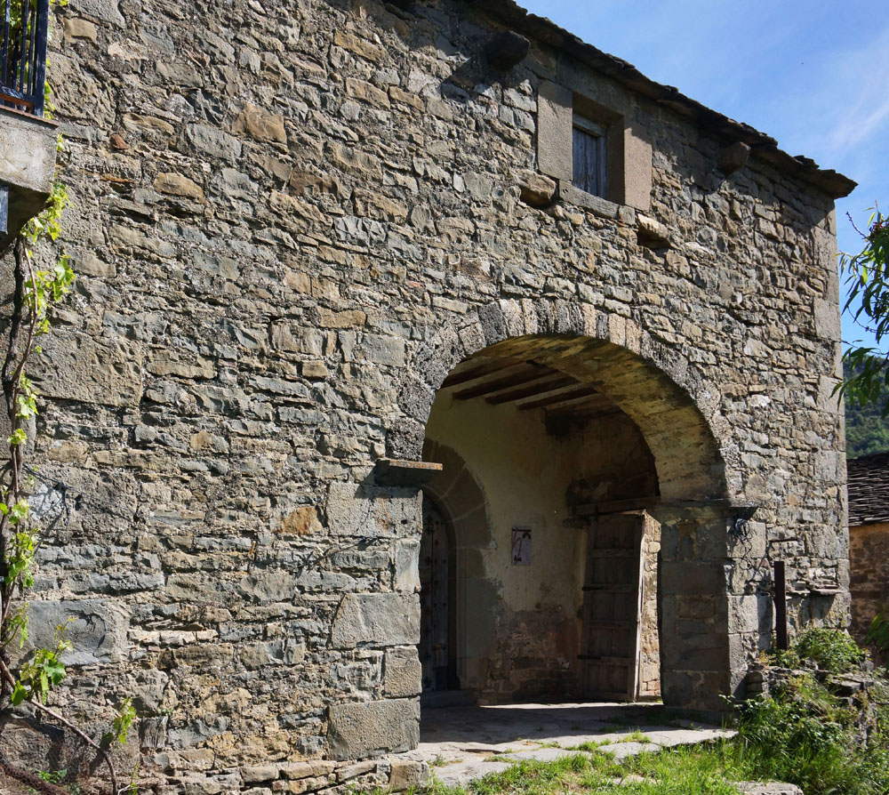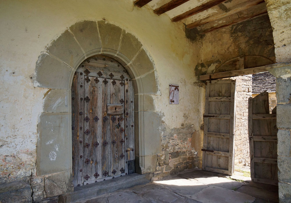 El acceso a la iglesia se encuentra en el lado sur, precedido por un largo pórtico rectangular que se abre en su frente mediante un gran arco de medio punto y por el lado norte a través de un hueco adintelado. La puerta es un sencillo vano en arco de medio punto.