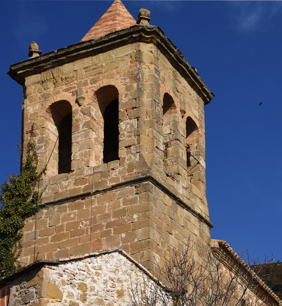 La torre, adosada al último tramo de la nave por el lado del Evangelio, tiene planta cuadrada y un solo cuerpo. En su parte superior presenta en todos los lienzos parejas de vanos para campanas coronados por arcos de medio punto realizados en ladrillo.