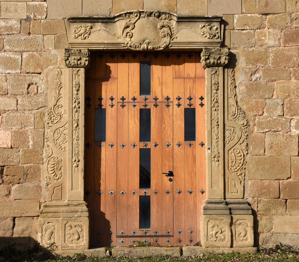 La portada se sitúa a los pies del edificio. Es un sencillo vano adintelado, con decoración vegetal y de rocalla, que apea en pilastras con capiteles de un estilizado orden compuesto y frentes decorados con guirnaldas y otros motivos barrocos.