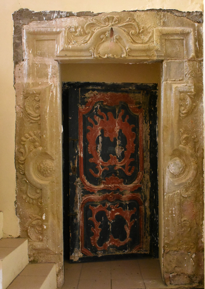 Destaca asimismo enormemente la puerta de la sacristía, que se abre en el ábside, por el lado del Evangelio. Es un vano adintelado recercado por una gruesa moldura de trazado mixtilíneo y decorada con relieves de rocalla, volutas y otros motivos barrocos, muy similares a los de la portada de la iglesia.