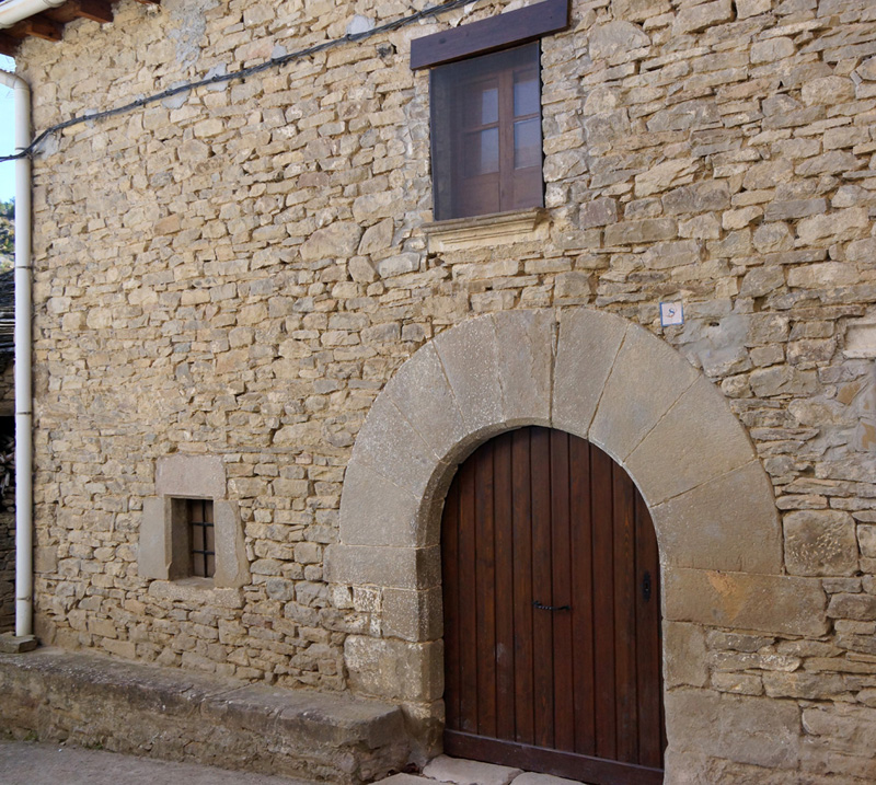 La fachada ha sufrido algunas reformas, pero conserva sus vanos originales en la planta baja: la puerta y una pequeña ventana. La puerta se encuentra en la parte central de la fachada. Es un vano en arco de medio punto de anchas dovelas, con la arista biselada, que apea en jambas también biseladas realizadas mediante sillares que alternan la disposición a soga y tizón. La ventana, a la izquierda, es un vano de pequeño tamaño con dintel y jambas monolíticos biselados y alféizar liso.