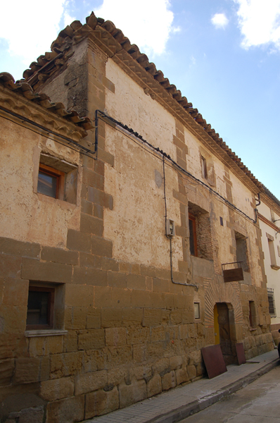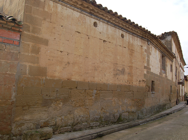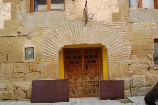 La fachada principal, que da a la calle Baja, presenta un zócalo de sillares bien trabajados y escuadrados en hiladas regulares que alcanza el trasdós del arco de entrada. El acceso a la casa se encuentra en disposición central y cuenta con un gran arco de ladrillo con intradós adintelado y salmeres tallados con perfil convexo, y jambas de piedra. En el lateral derecho de la planta baja se abrió un vano adintelado que pudo servir como acceso para verter las uvas al cubo del lagar. A partir del zócalo son visibles las cadenas y esquinazos de piedra sillar que enmarcan y dividen verticalmente los paños donde se abren los vanos en esta fachada. En el piso principal se abren dos grandes ventanas enmarcadas por fábrica de ladrillo, con dintel trapezoidal, rosca resaltada y arco de descarga rebajado. En la planta superior únicamente se abrió una ventana adintelada en el paño central de la fachada. El alero está compuesto por tres hiladas de ladrillo plano donde se combinan las filas de ladrillo atizonado dispuesto longitudinalmente con una en medio de ladrillos colocados en diagonal en forma de diente de sierra o esquinilla.