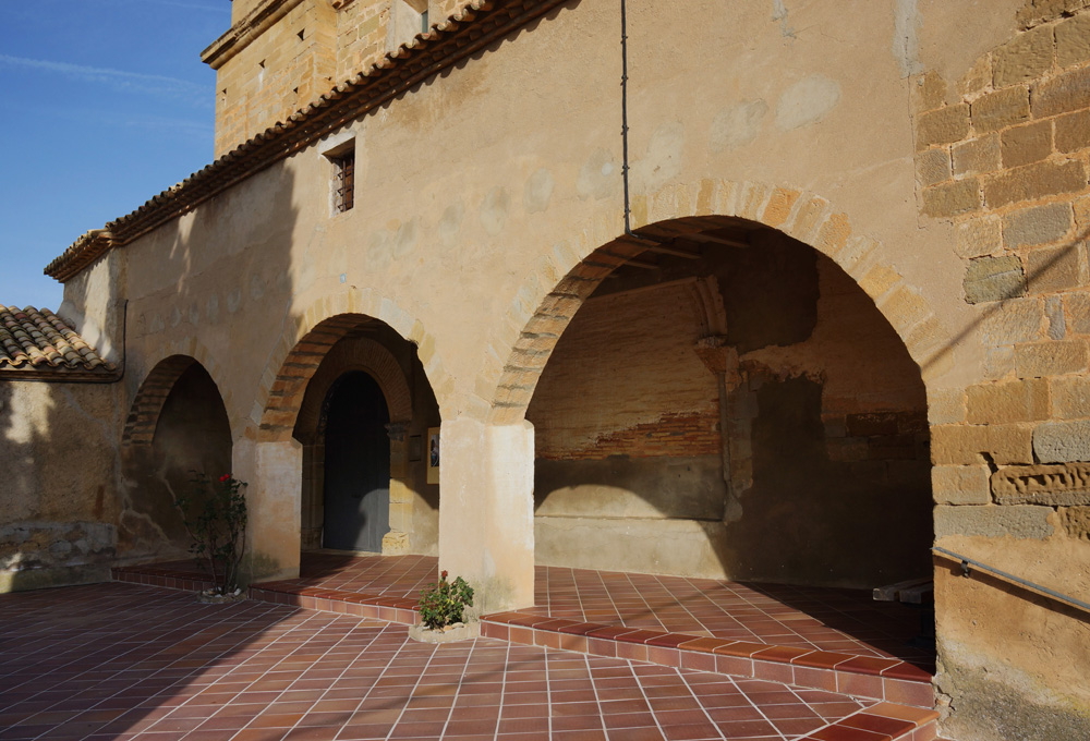 Al exterior destaca en el lado sur el cuerpo en el que se encuentran el pórtico y la sacristía. Está abierto mediante tres arcos de medio punto. En su interior está la antigua portada románica, de grandes dimensiones y actualmente cegada, en arco de medio punto; tiene dos arquivoltas en bocel que apean sobre capiteles decorados con motivos figurativos trabajados de forma tosca (animales, tres personajes dispuestos ante una mesa) y columnas.