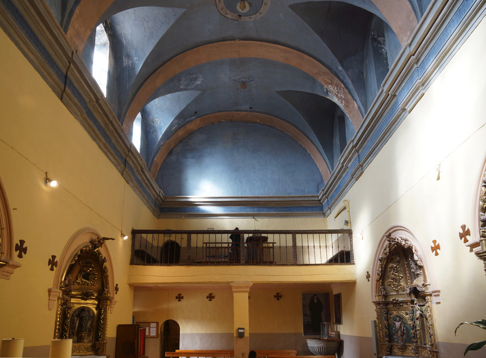 En el tramo situado a los pies se encuentra el coro alto. Es una sencilla obra sostenida por una jácena frontal reforzada por un pilar en su parte central.