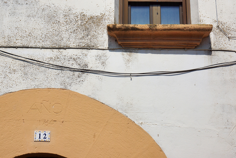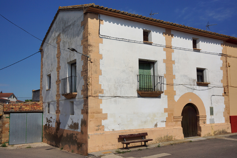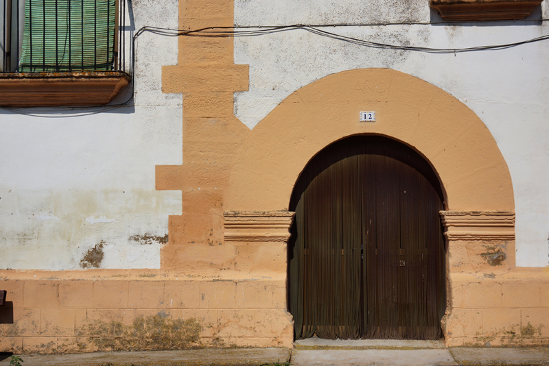 En la fachada, situada en uno de los lados largos del edificio, destaca especialmente la puerta de acceso, descentrada hacia la derecha y encajada parcialmente en la cadena central. Es un vano cerrado por un arco de medio punto liso, con una inscripción en la clave que indica “AÑO 1784”. El arco apea en salmeres muy moldurados mediante una sucesión de finos listeles y toros, y en unas cortas jambas lisas que arrancan de las hiladas resaltadas del zócalo.