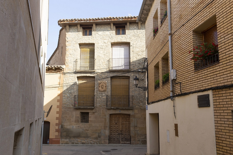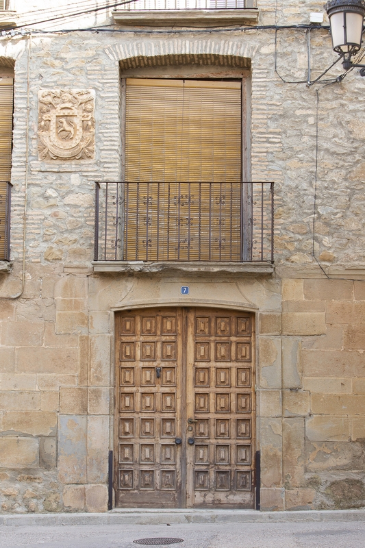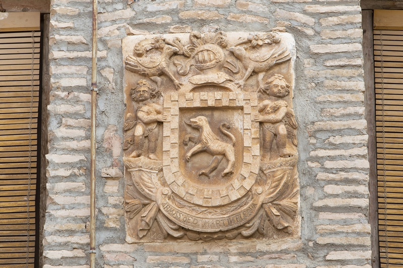 El escudo se encuentra en la planta principal, entre los balcones, en el lado izquierdo. Al exterior, tiene decoración de lambrequines vegetales, con dos aves en la parte superior y está coronado por timbre de hidalguía. En la parte inferior, aparece una cartela inscrita en la que se lee: “ARMAS DE D. MARTÍN BLECUA” “AÑO 1808”. El escudo es sostenido por una pareja de ángeles. Cuenta con un solo campo, enmarcado por un ajedrezado. Dentro aparece representado un león rampante con las fauces abiertas.