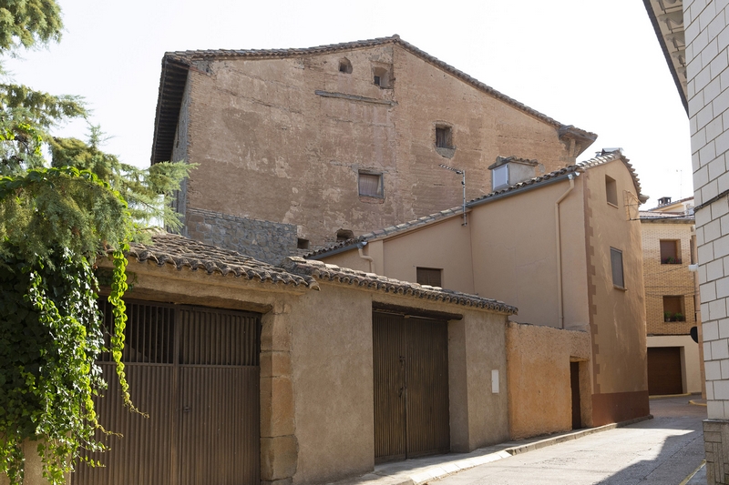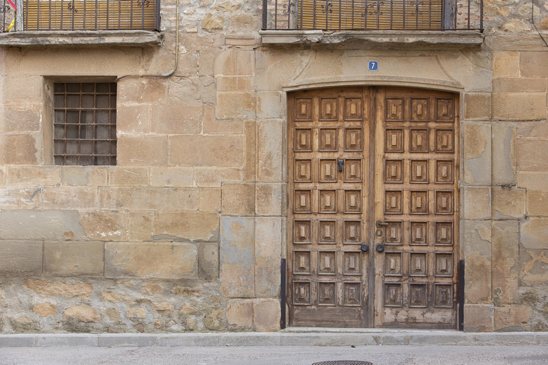La puerta se abre en el centro de la planta baja. Es un vano arquitrabado, aunque con el dintel algo curvo y decorado con un bajorrelieve poligonal rehundido. El vano está realizado con dovelas de tamaños regulares. A los lados de la puerta, hay dos pequeñas ventanas adinteladas de similar tamaño, cerradas con un enrejado metálico.