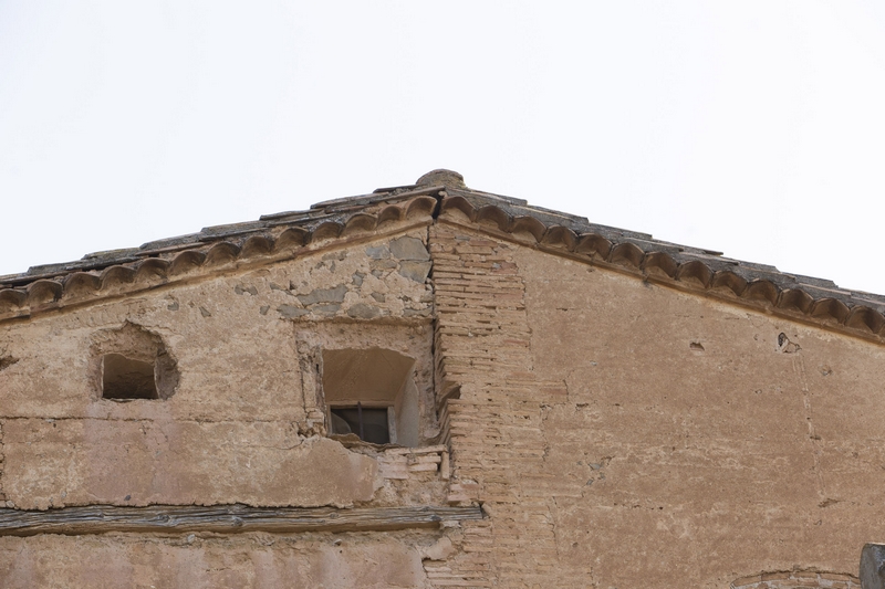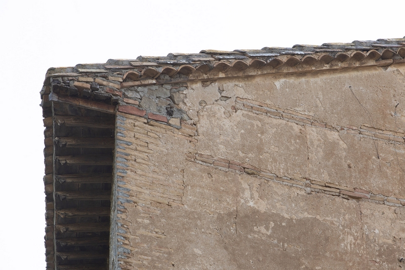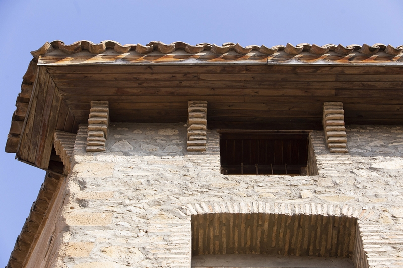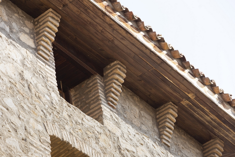 El alero de madera, muy volado, apoya sobre ménsulas de ladrillo dispuesto de forma escalonada.
