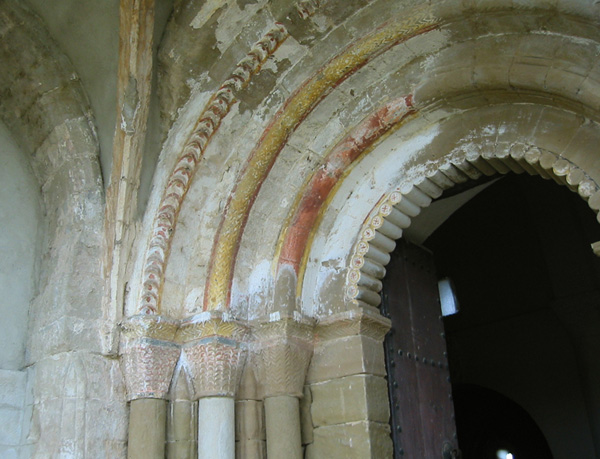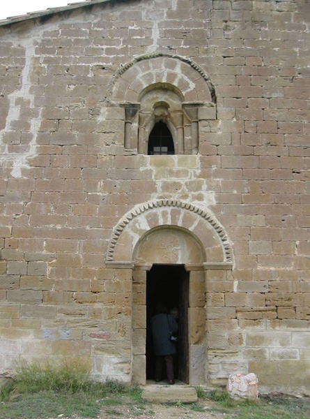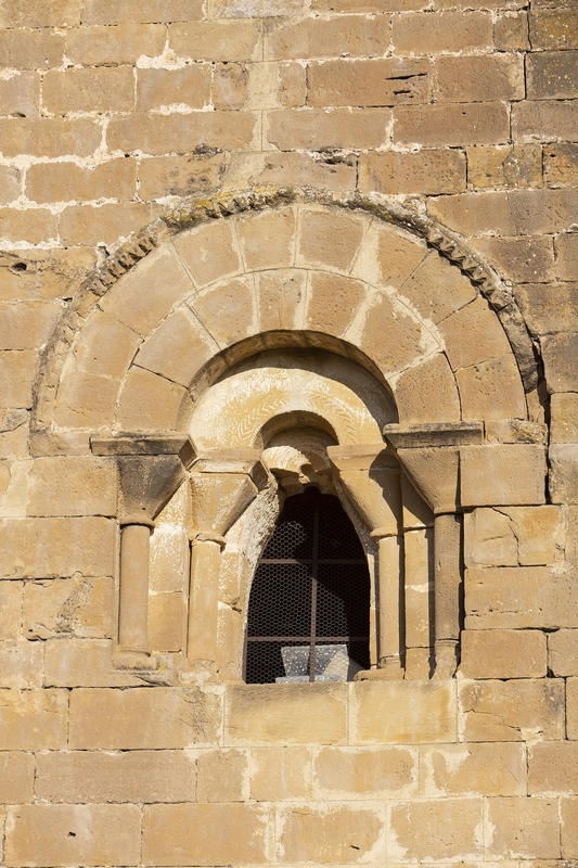 Sobre esta puerta se abre una interesante ventana en doble arco de medio punto, el primero monolítico y el segundo dovelado, apoyados ambos sobre columnas con capitel troncocónico. Están enmarcados por una tercera franja de dovelas a modo de arquivolta integrada en el muro y una moldura con puntas de diamante similar a la de la puerta inferior.