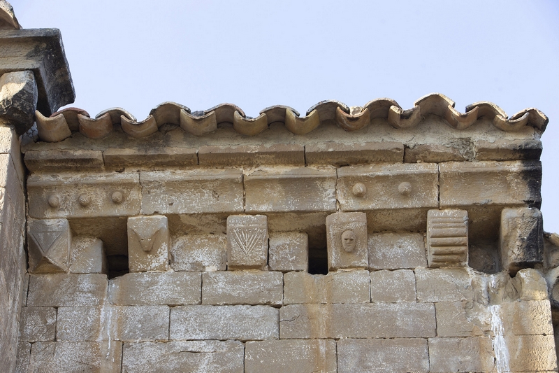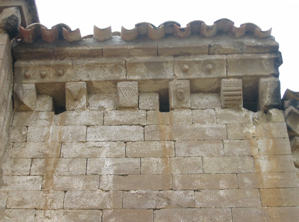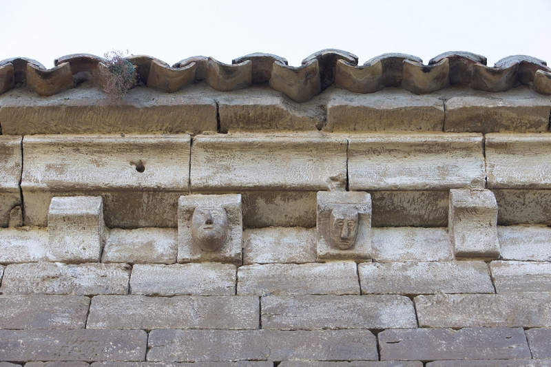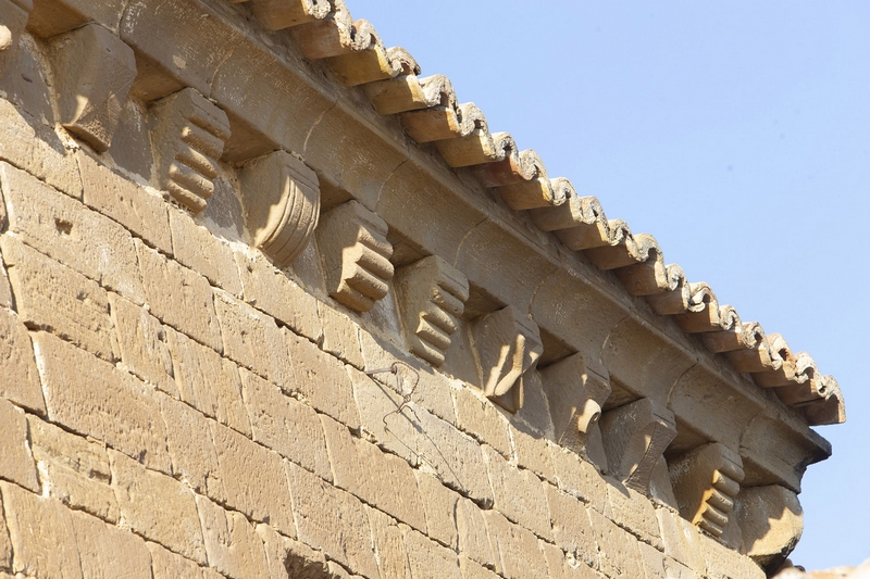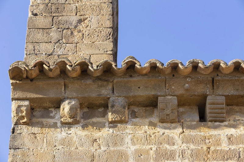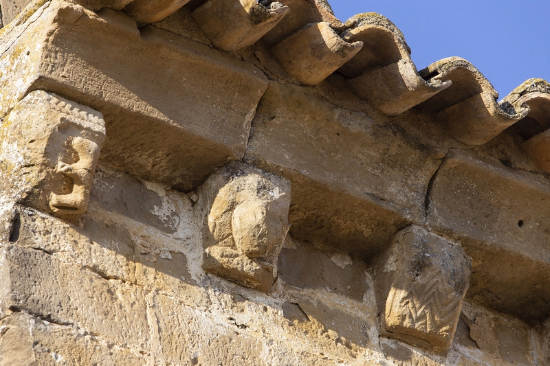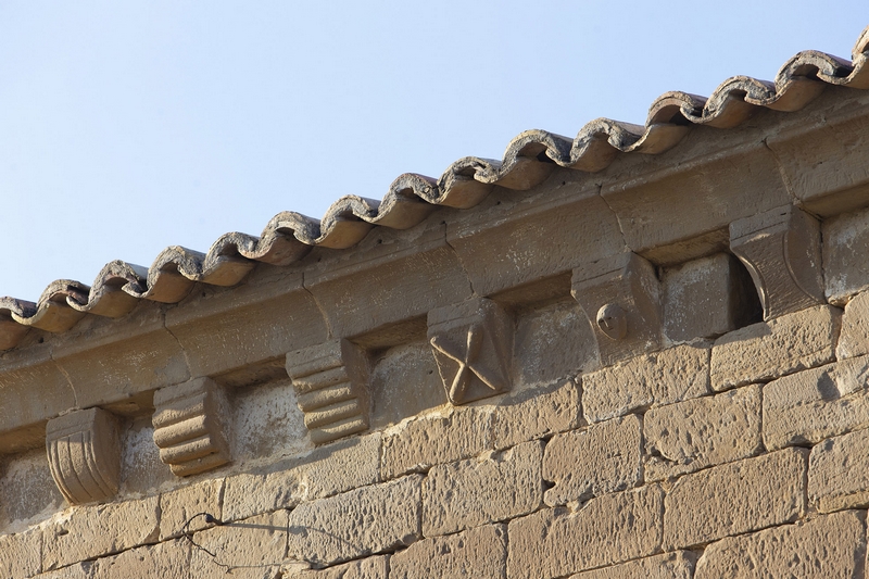 El alero está sostenido por ménsulas de piedra que presentan diversos motivos decorativos (rostros, elementos geométricos) de factura tosca.
