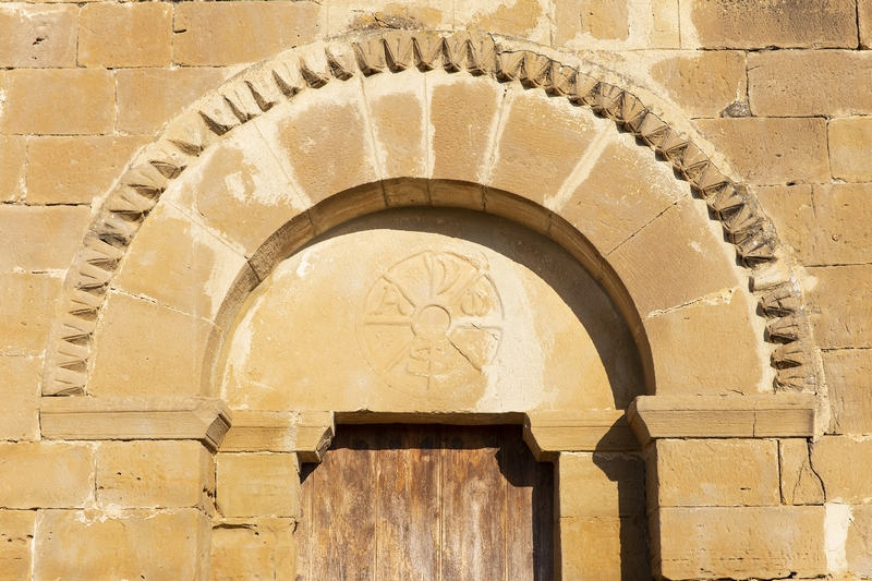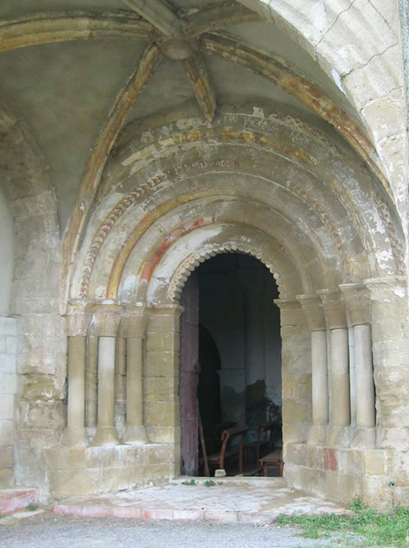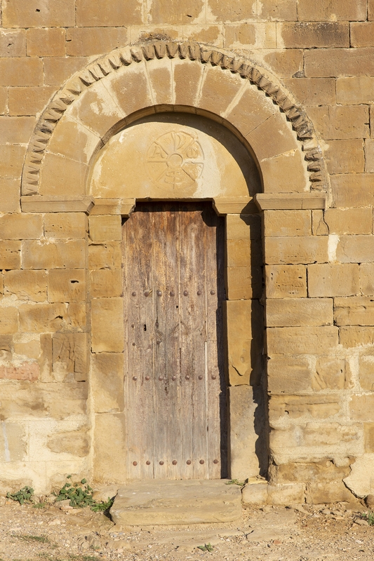 La del muro de los pies, antiguo acceso desde el exterior, es de menores dimensiones. Abre en arco de medio punto enmarcado por una moldura decorada con puntas de diamante; presenta tímpano con un sencillo crismón en relieve muy erosionado.