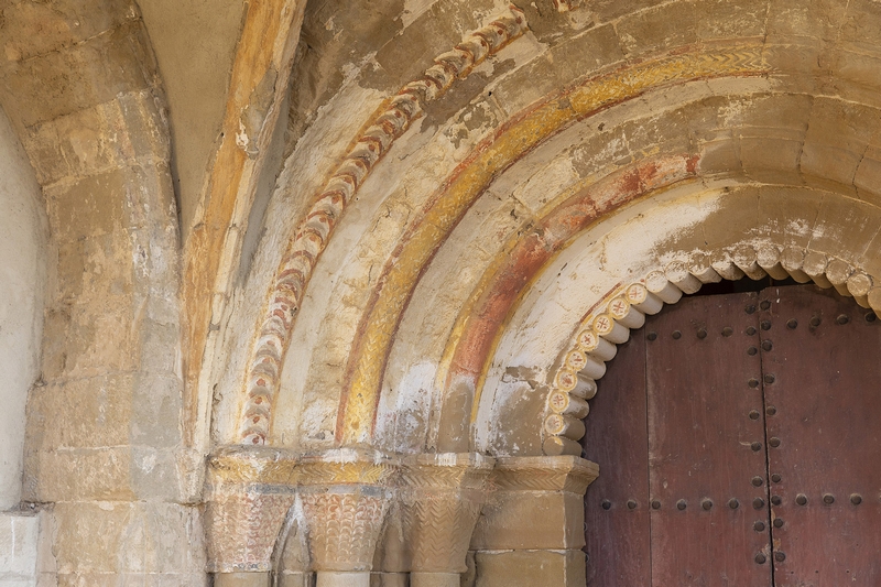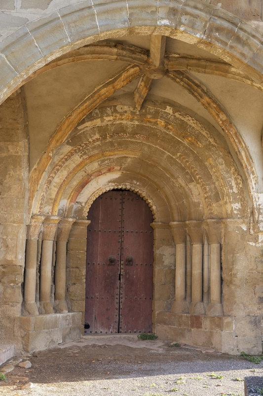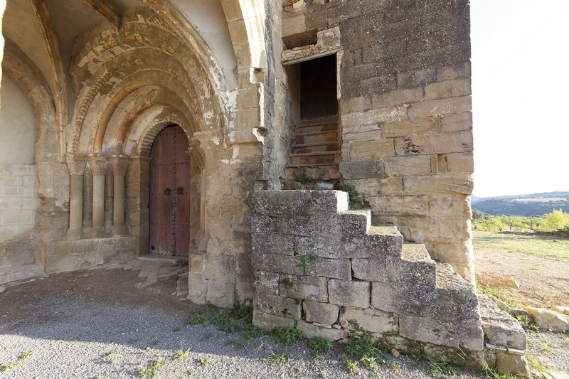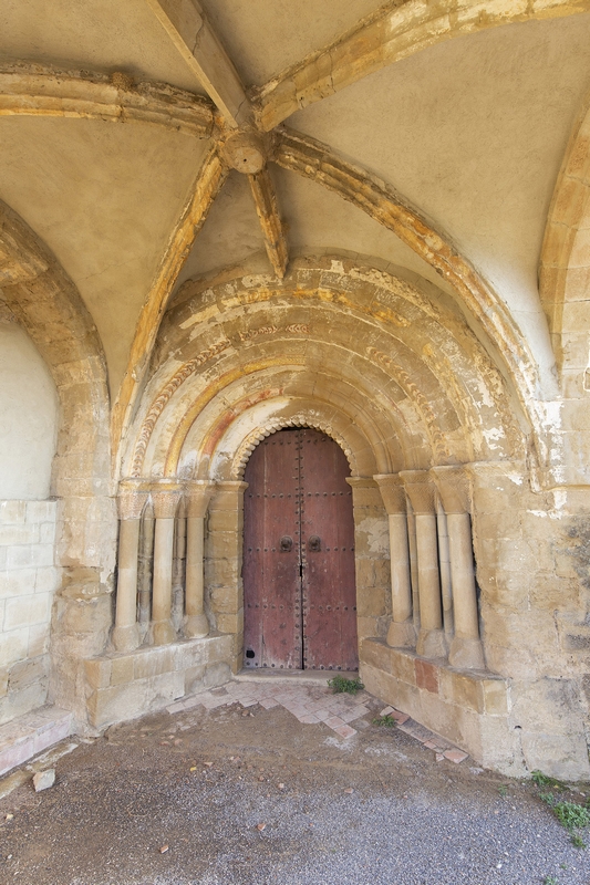 Hay dos puertas de acceso. La que se abre en el muro norte da al lugar donde estaba el claustro y serviría para entrar desde el recinto monástico. Está precedida por un pórtico cubierto con bóveda de crucería encajada en arcos de trazado apuntado. Abre en arco de medio punto, cuyo intradós está recorrido por una banda de baquetones y se halla enmarcada por tres arquivoltas; éstas, que apean en capiteles con decoración geométrica, combinan la decoración en espiga con el ajedrezado.