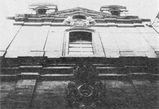 El primer cuerpo alberga la puerta de acceso, bajo arco de medio punto con dovelas de piedra y trasdós moldurado . Sobre el arco se emplaza un escudo de la congregación, tambien en piedra. El segundo cuerpo alberga un ventanal bajo arco rebajado. Sobre él el anagrama de María en piedra, el cual sostiene unóculo que se superpone al campo del frontón. La separación entre este último y el segundo cuerpo se realiza mediante entablamento quebrado.