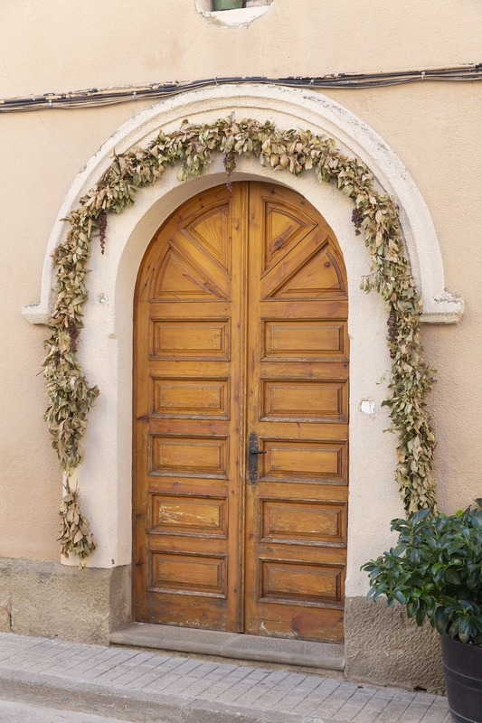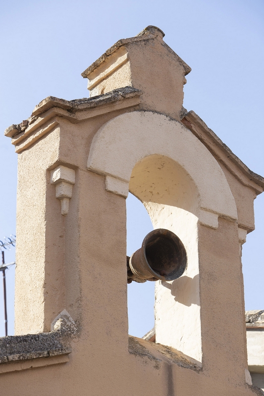 La puerta se abre en el hastial. Es un vano en arco de medio punto, trasdosado por moldura. Sobre ella, una alargada ventanita en arco de medio punto recercado por un resalte de yeso y, rematando el hastial, una espadaña de un solo ojo también en arco de medio punto.