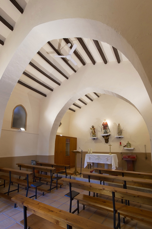 Es una ermita de planta rectangular y cabecera recta, encajada entre las dos viviendas contiguas.