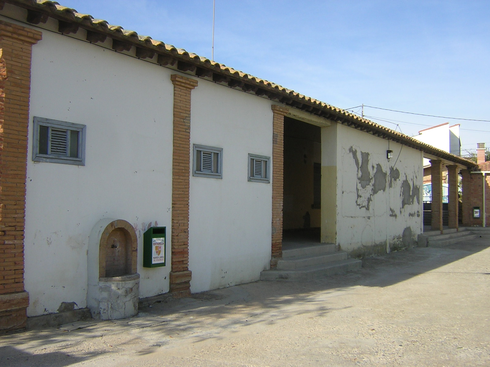Sus paredes son de ladrillo y están revocadas. Tiene cubierta a dos aguas de teja árabe con caballete paralelo a la fachada y dos pequeñas vertientes en los lados cortos. Las ventanas son ortogonales y presentan un alféizar de ladrillos a sardinel.