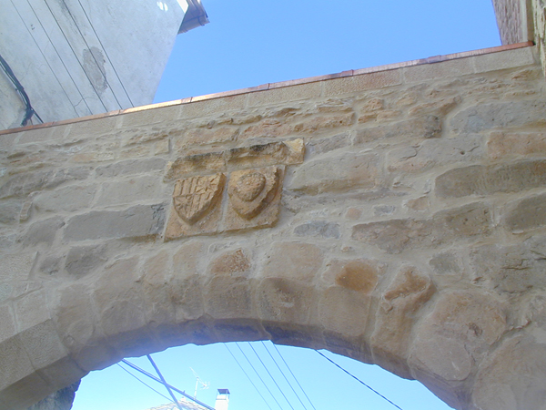La puerta es de arco de medio punto. Está construida con obra de sillar y en el paramento superior porta escudos nobiliarios, relativos a la fusión que se dió entre la familia de los Castro y la catalana de Pinós. Se hallan acolados.