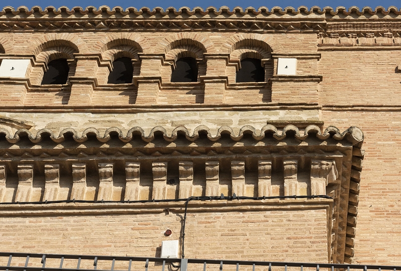 Al exterior, en la parte superior de los muros, se abre una galería de arcos de medio punto de ladrillo.