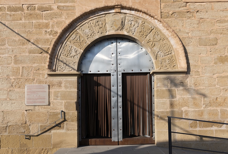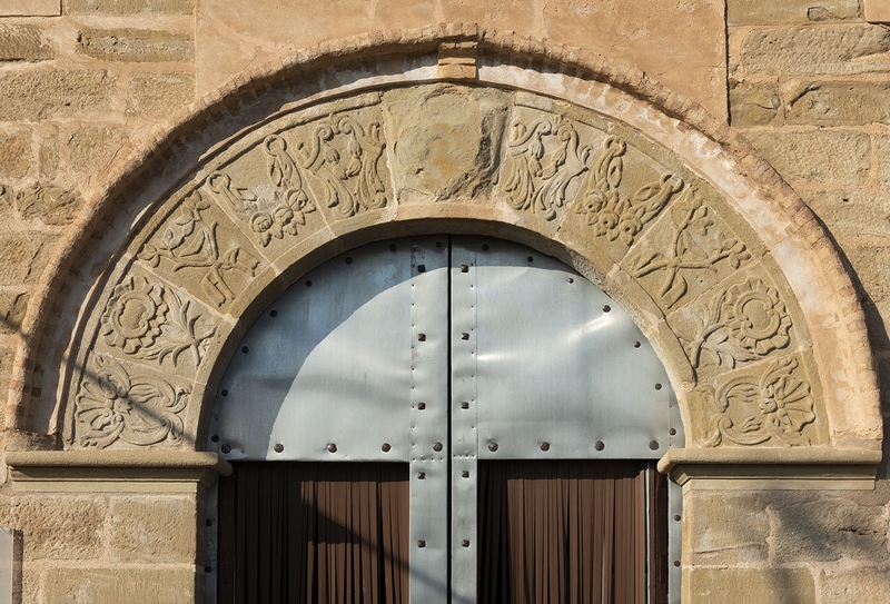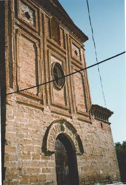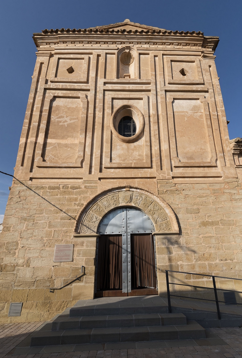 La puerta de ingreso se abre a los pies, en arco de medio punto con dovelas decoradas mediante relieves vegetales. La protege un guardapolvo de ladrillo.