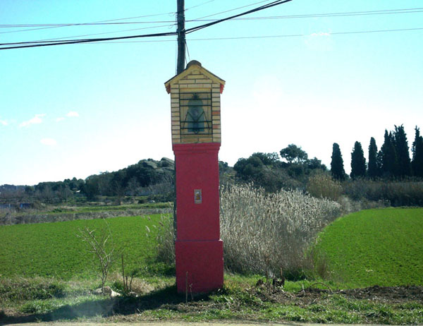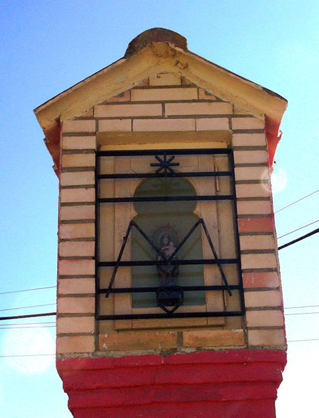 Pilar prismático de planta cuadrada formado por tres cuerpos: una basa, un fuste liso en el que se han colocado baldosas con las imágenes de santos en todos sus laterales, y un edículo construido en ladrillo, en cuyo frente se abre una capilla en arco de herradura que alberga la imagen de la Virgen con niño. Se remata con tejado a doble vertiente.