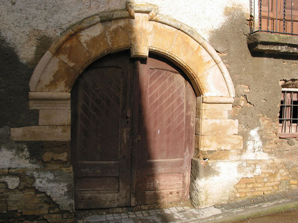 El acceso, en la parte central, se realiza por puerta abierta en arco de medio punto rebajado construido en piedra sillar, con las dovelas enmarcadas por una moldura exterior en resalte hasta la línea de imposta, también moldurada, y otro baquetón más fino en la parte inferior de la rosca del arco. En la clave, más estrecha y prolongada por sus extremos superior e inferior respecto al resto (generando un escalonamiento en la moldura que la enmarca) aparece una cruz incisa enmarcada por un rombo.
