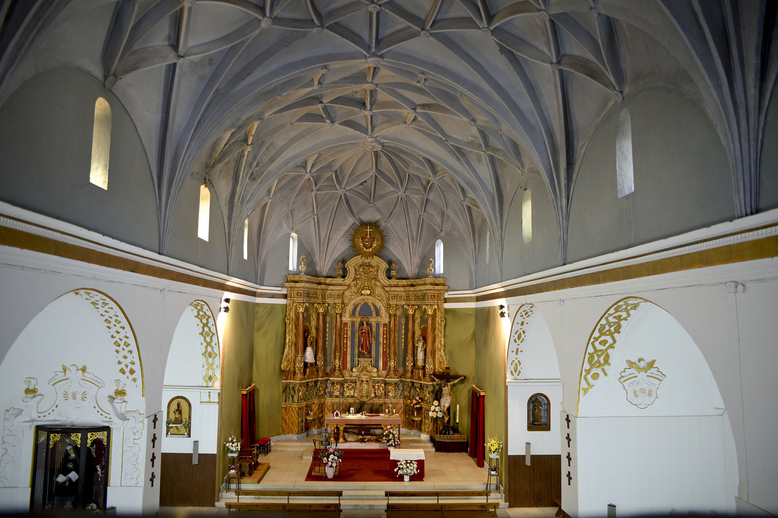 El interior consta de una única nave, dividida en cuatro tramos, con capillas laterales en los tres primeros. Tanto la cabecera como todos los tramos de la nave están cubiertos con bóvedas de crucería estrellada de diseños muy complejos a base de una gran profusión de nervios diagonales, terceletes, combados, etc.