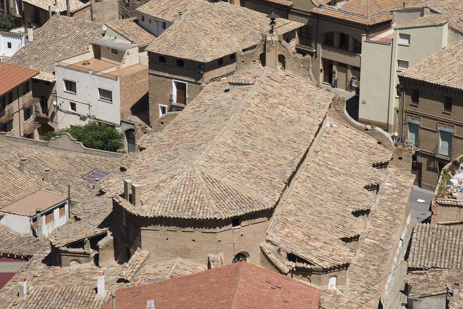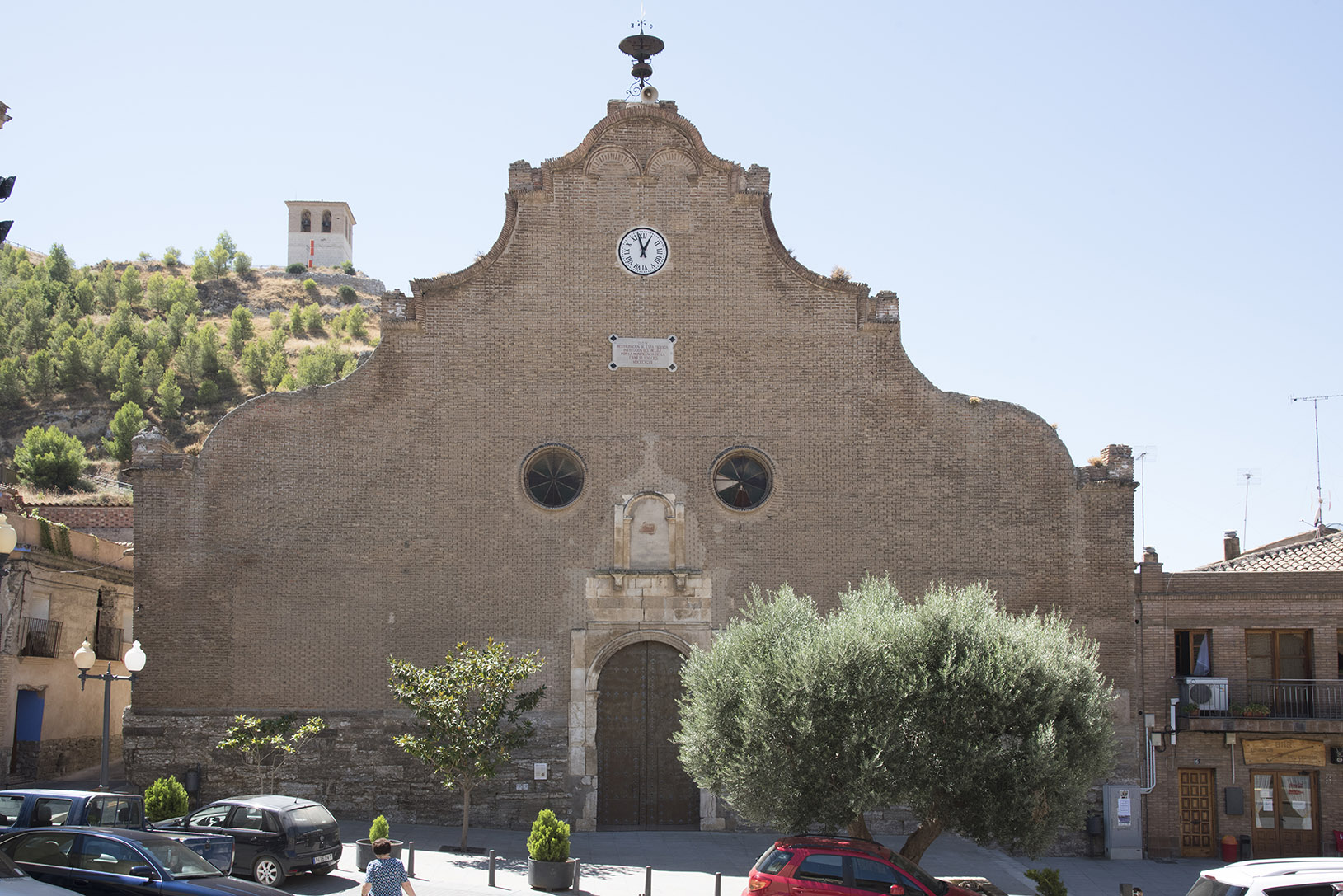 Iglesia de ladrillo aparejado a tizón sobre basamento de piedra sillar de yeso. Es de planta rectangular constituida por tres naves, la central más ancha que las laterales, y cabecera poligonal de tres lados. En alzado se refleja la estructura interna de la iglesia destacándose claramente el volumen más elevado de la nave central, los cimborrios octogonales de las cinco capillas que conforman cada una de las naves laterales y los contrafuertes que apoyan los paños del ábside. La cubierta es de teja árabe, a doble vertiente sobre la nave central, dividida en paños sobre el ábside y continua a una vertiente sobre las capillas.