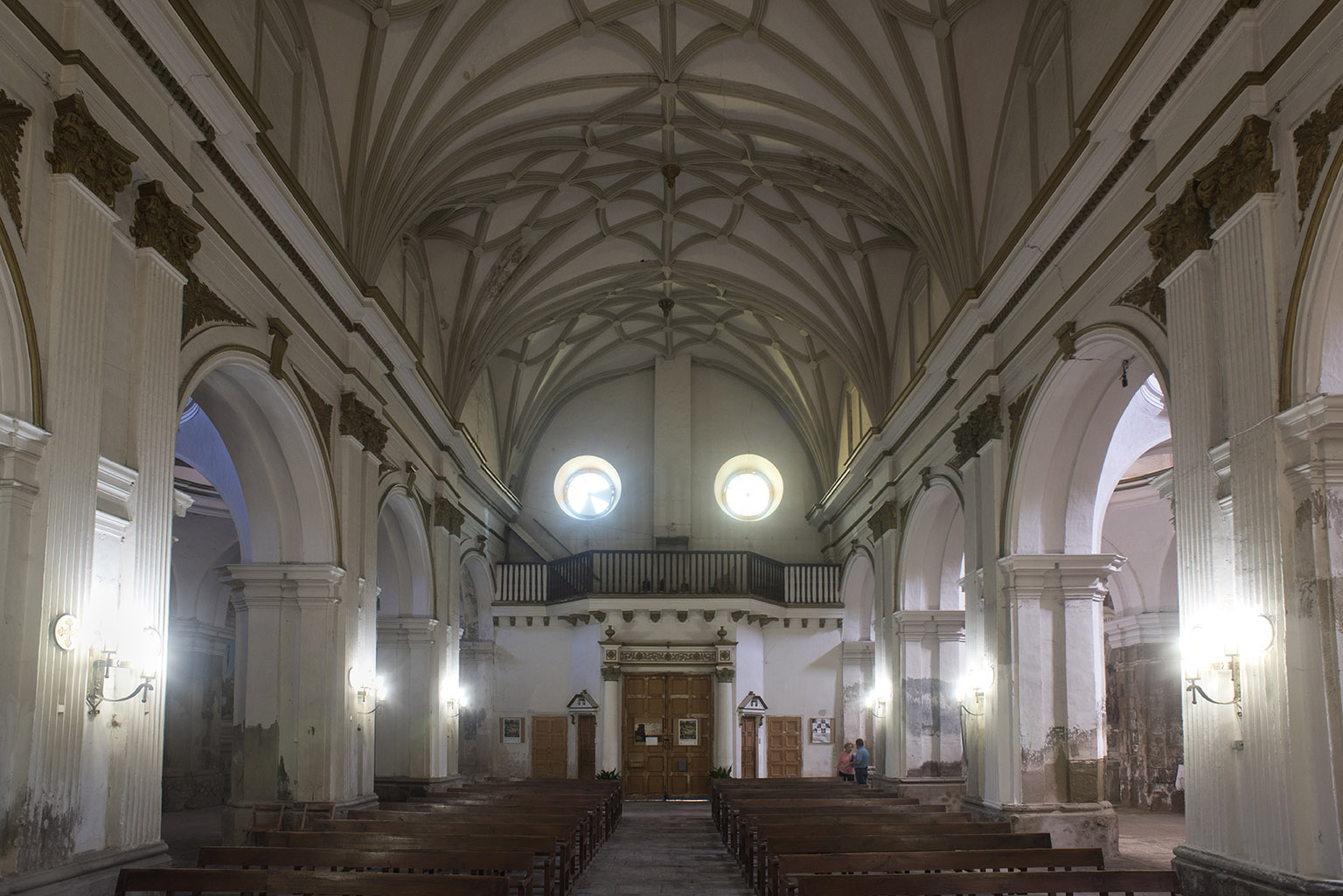 El interior, de gran amplitud y altura, se articula en tres naves mediante arcos formeros de medio punto que apean sobre gruesos pilares decorados mediante pilastras dobles de capitel corintio. Sobre ellas corre un potente entablamento moldurado que continúa por el ábside y por los pies de la iglesia unificando todo el espacio. Sobre él descansan las bóvedas de crucería estrellada de complicado diseño que son las del primitivo templo tardogótico y que se conservan en la nave central y en el ábside. Las capillas de las naves laterales se cubren con cúpulas sobre pechinas cuyo interior queda dividido mediante nervios en paños con lunetos en los que se abren ventanas. Las pechinas de una de las capillas están decoradas con pinturas murales barrocas en las que se representa a los Santos Padres de la Iglesia, aunque muy oscurecidas.